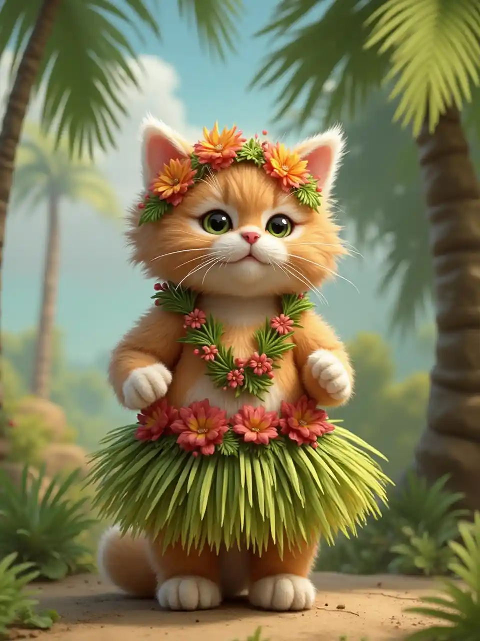 JonathanPetit chat poilu déguisé en danseur de jupe sur paille à Hawaï debout sous un palmier