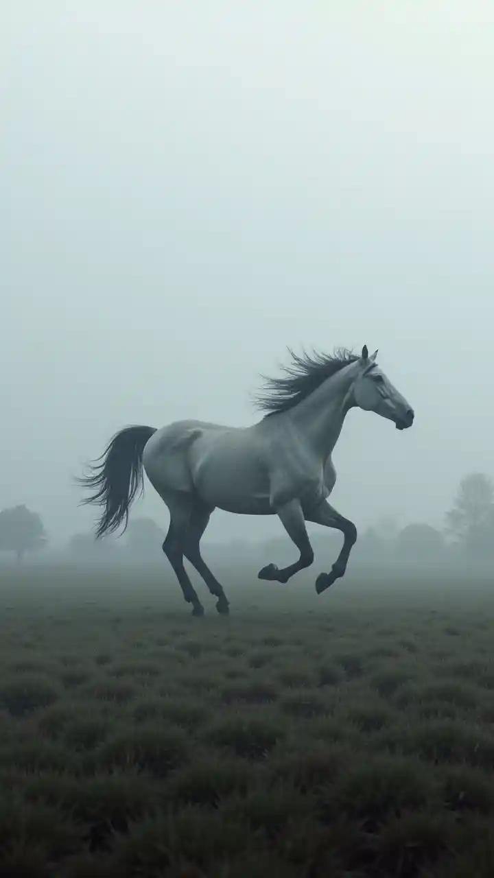 Un vaste champ ouvert, enveloppé d'un épais brouillard, sans aucun arbre. Au premier plan, un objectif du corps entier capte un étalon gris puissant et réaliste galopant à mi-chemin, ses muscles sont tendus et sa crinière est élégante. Les postures dynamiques dégagent de l'énergie et de l'élégance, amplifiant les sensations épiques du moment. La scène est méticuleuse et le brouillard ajoute une texture éthérée, créant une image éditoriale enivrante.