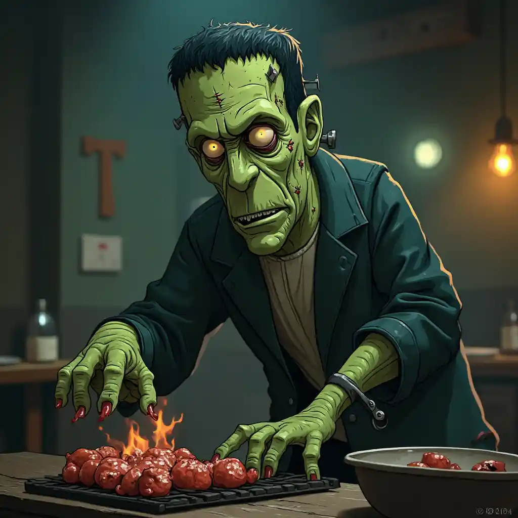 Boris Karloff incarne un cartoon complet de Frankenstein, peau verte, palette douce, atmosphère, flippant, détails complexes, cadavres ressuscités, tissus cicatriciels, pourriture, yeux vedettes, accueil, boulons qui dépassent de chaque côté du cou, gangrène, veines, mutilations, points de suture frontale, barbecue alimentaire au restaurant
