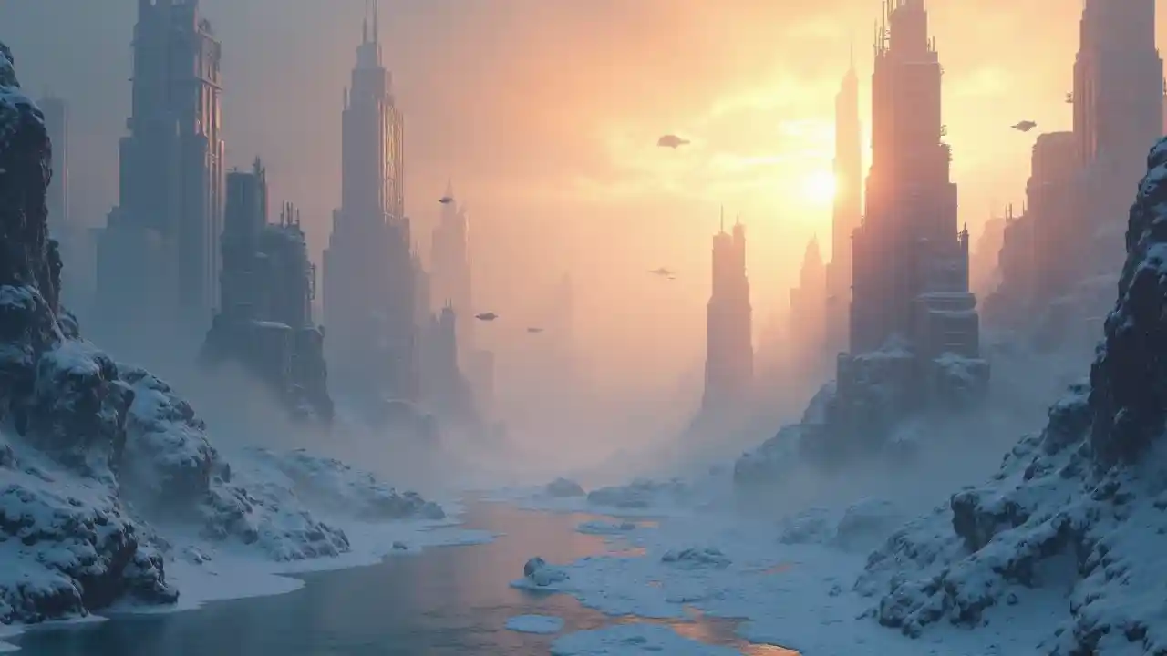 Une ville gigantesque où de nombreux gratte-ciel ont été recouverts de gel et de neige à l'ère glaciaire apocalyptique. La ville est submergée par un océan complètement gelé. Des dizaines de vaisseaux spatiaux extraterrestres et de science-fiction volent entre les imposants gratte-ciel, créant une atmosphère surréaliste et extraordinaire. Un épais brouillard. Air glacé. Coucher du soleil