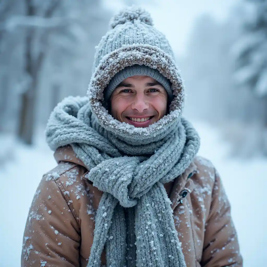 Un adolescent, enveloppé dans une couche de glace, congelé sur son corps, avec des pois, des gants et des écharpes gelés. Tout cela était dans un temps d'hiver de blizzard inférieur à zéro. Tous les vêtements, les cheveux, le visage et le corps étaient gelés dans la glace → Laissez-le neiger dans une tempête de neige. Tous les vêtements sont recouverts de glace. Des colonnes de glace se forment sur les vêtements. Laissez le dossard/écharpe couvrir le visage gelé