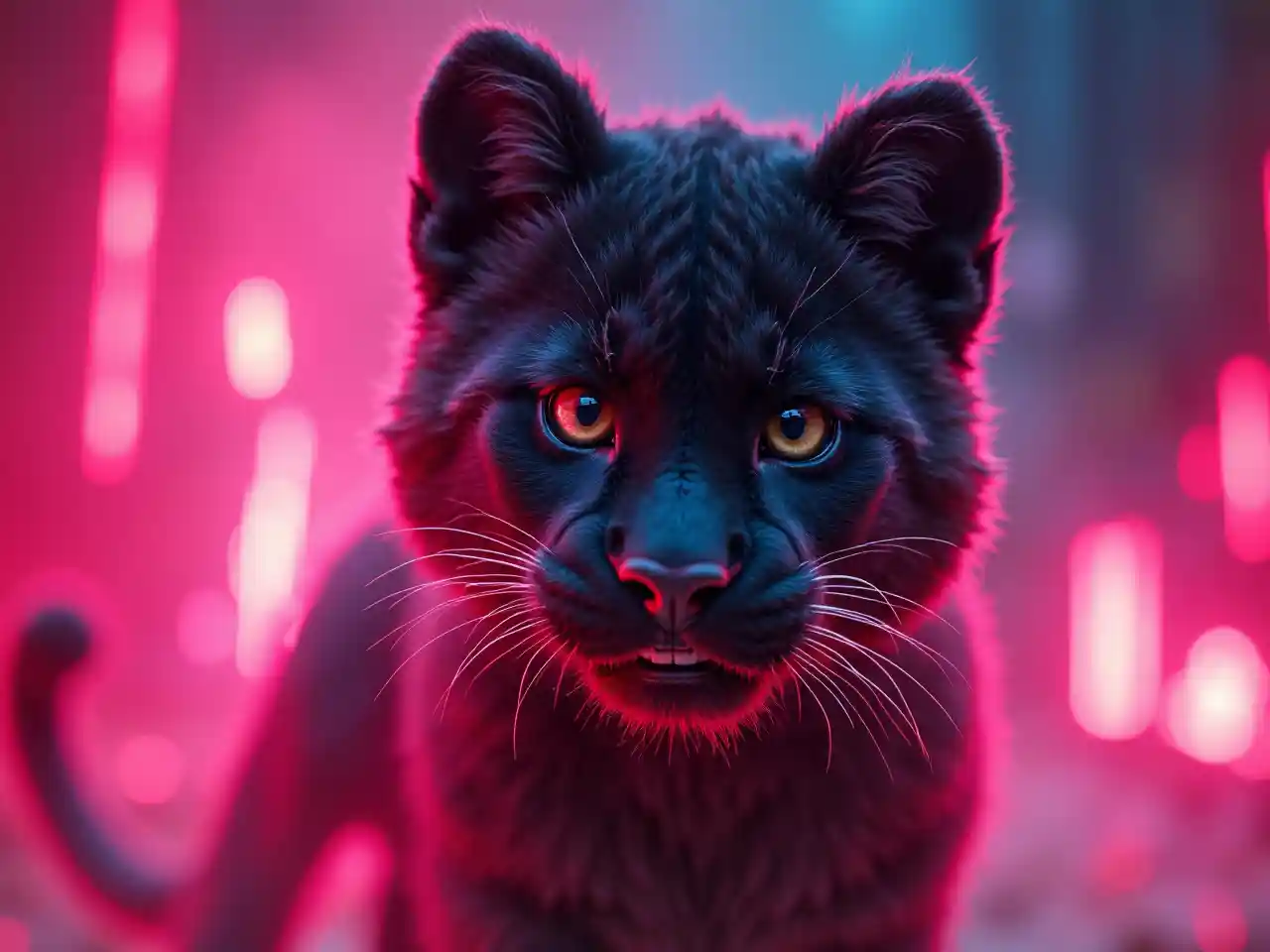 Une mignonne panthère velue regarde la caméra entourée de flammes roses fluo