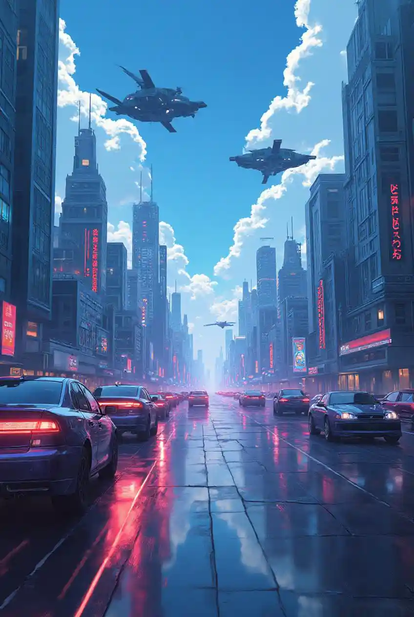ColtenCybernetic skyline with flying cars and holograms, reflecting a futuristic anime realm.