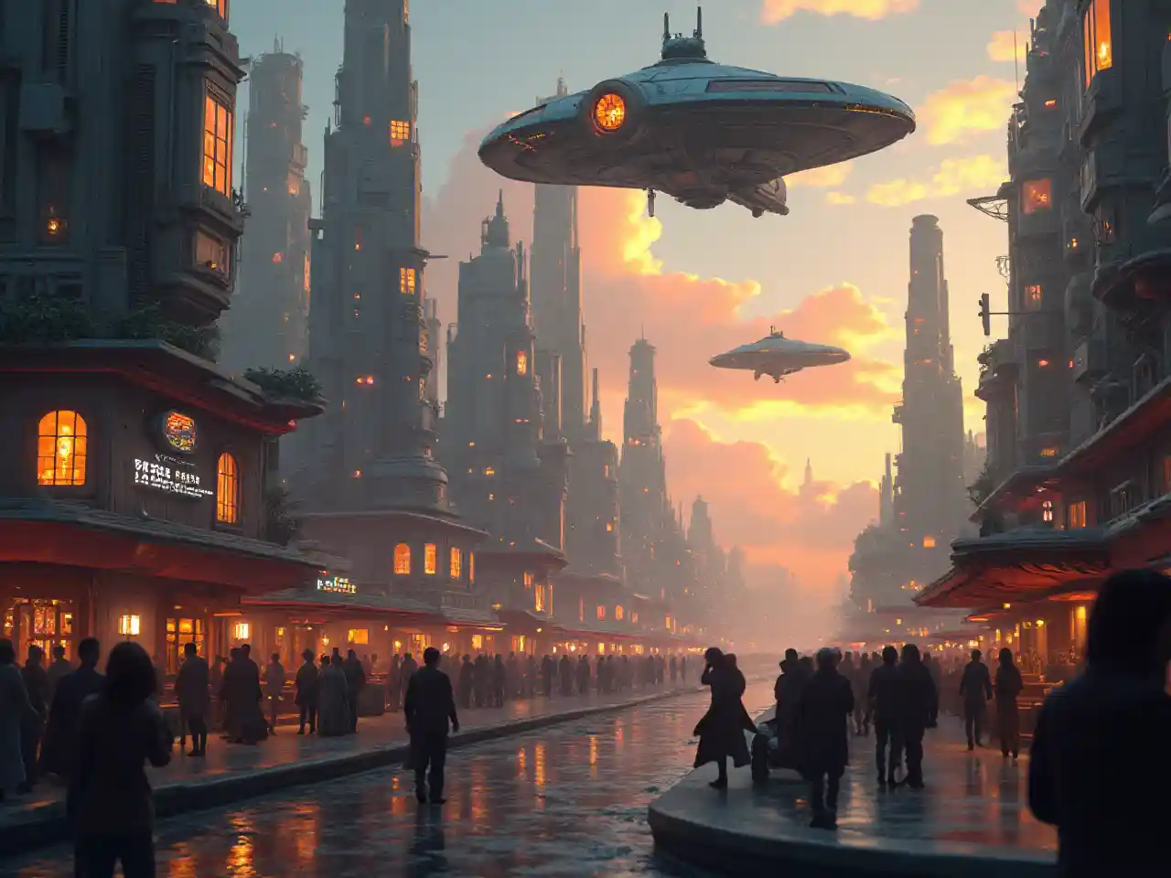Une vision futuriste de la ville avec des véhicules volants et des détails surréalistes