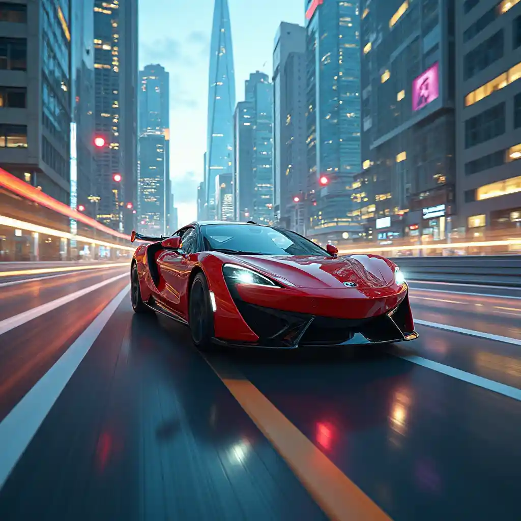 Une voiture de sport qui fait la course à travers le paysage urbain du futur