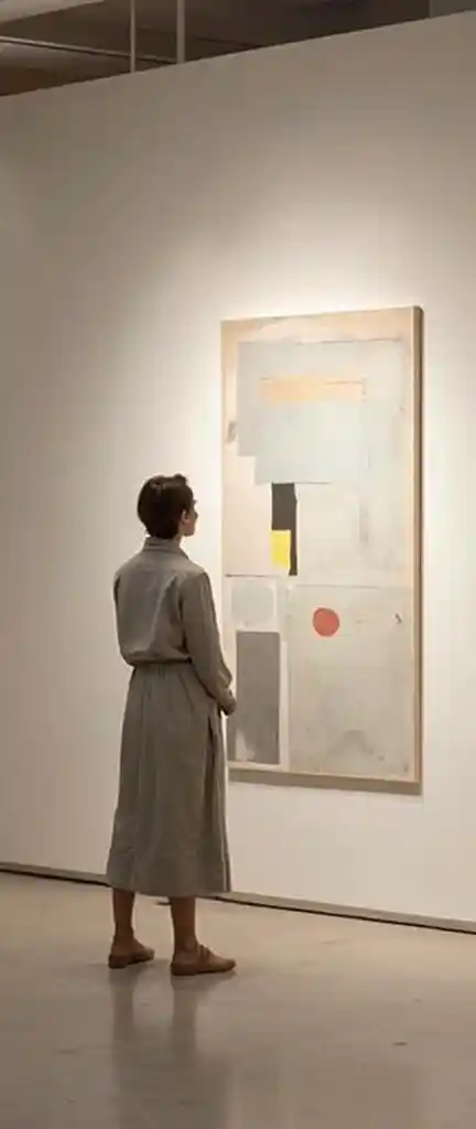PeytonUne grande composition verticale représentant une femme debout dans un musée d'art moderne, regardant un grand tableau minimaliste sur le mur; ce tableau est un B abstrait