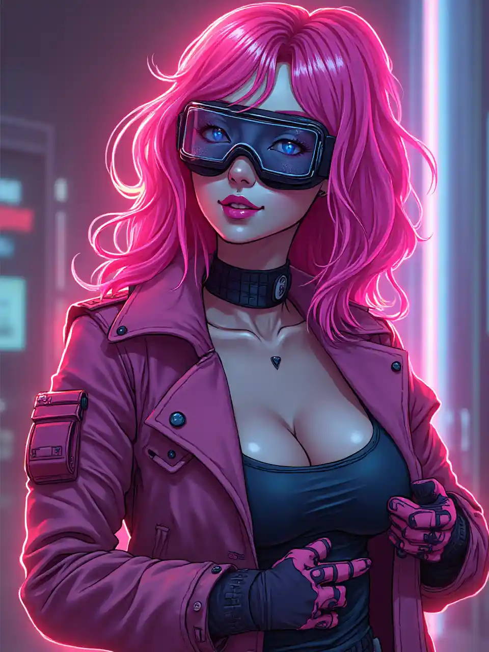 (Police spéciale), (Pixel Art), détails, torse, gants, masque, lunettes de protection, posture d'action, coupe-vent, rose, surréaliste, étrange, (photo de cheveux roses d'une joueuse sexy sur tout le corps), thème néon à vapeur, femme, portrait, sourire, rire, bouche ouverte, (haut du corps, prise de vue sur le buste, détournement des yeux: 1,1), cheveux néon, révélant les seins