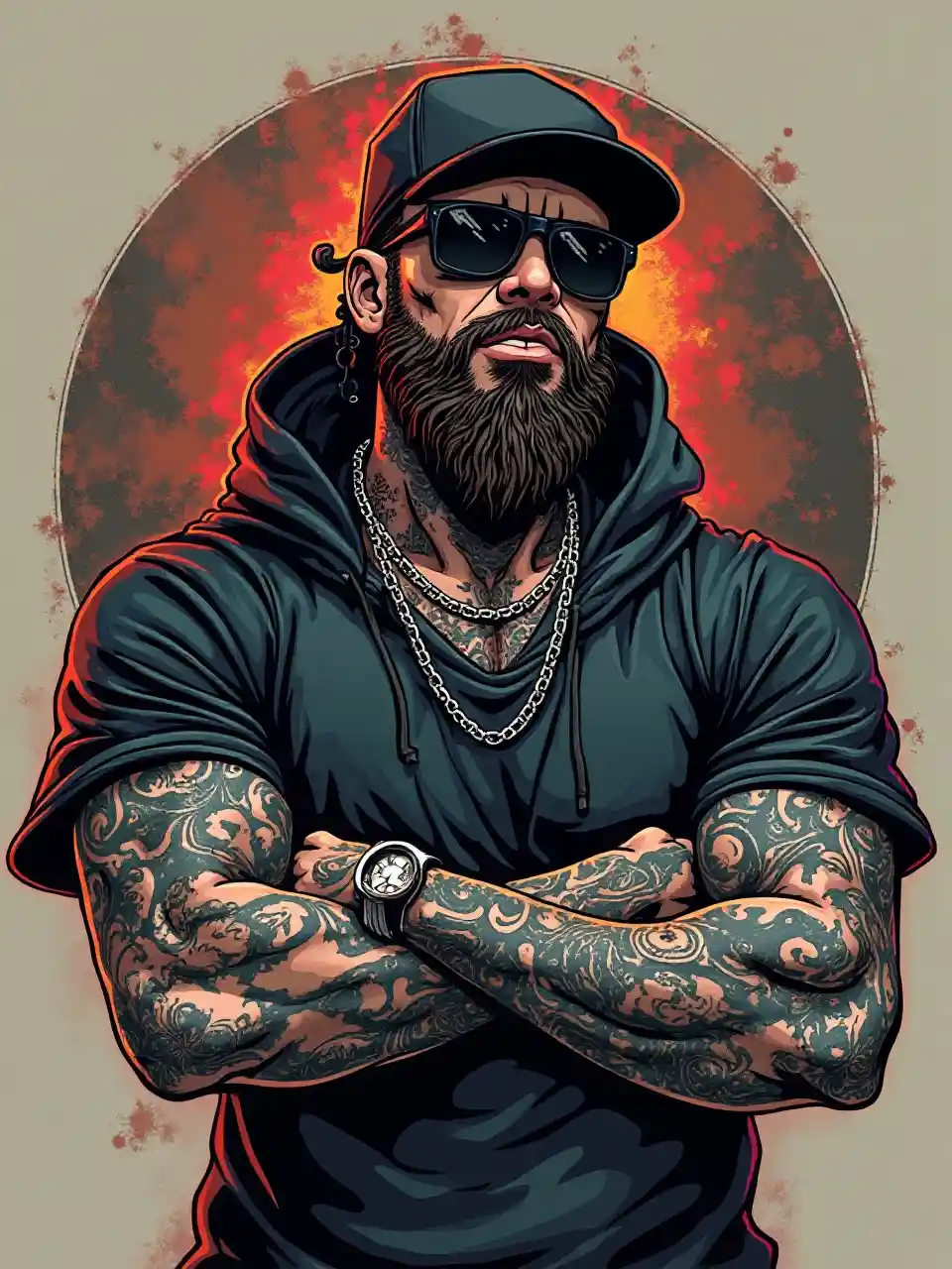 Tatouages sans barbe Tête rasée Homme fort avec un logo simple Art, Colère et colère, boîtes tresses et chapeaux, lunettes de soleil, membres de gangs, gangster des années 90, bras croisés, vêtements amples, vrai foulard et chemise sur le visage Rock, chaînes argentées, détails surréalistes et subtils, vraies couleurs, 8k, uHD, manga, justicier fantôme style, sweat à capuche ghetto derrière l'image centrale, fond turban rond, vagues de vapeur style bad boy