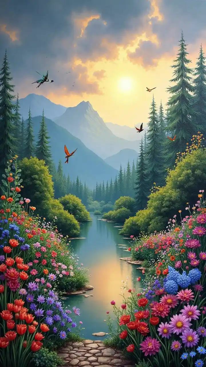 Une peinture à l'huile de jardin vibrante, sous le ciel gris dégradé dégradé éclairé par la tempête, des lumières vives et une douce couche de pluie se superposent sur les fleurs colorées, les papillons volent, les colibris planent et un étang paisible reflète les collines lointaines, les forêts luxuriantes, et les montagnes majestueuses, habilement conçues pour la richesse et la profondeur avec des coups de pinceau doux et mélangés, créant une atmosphère attrayante et paisible.