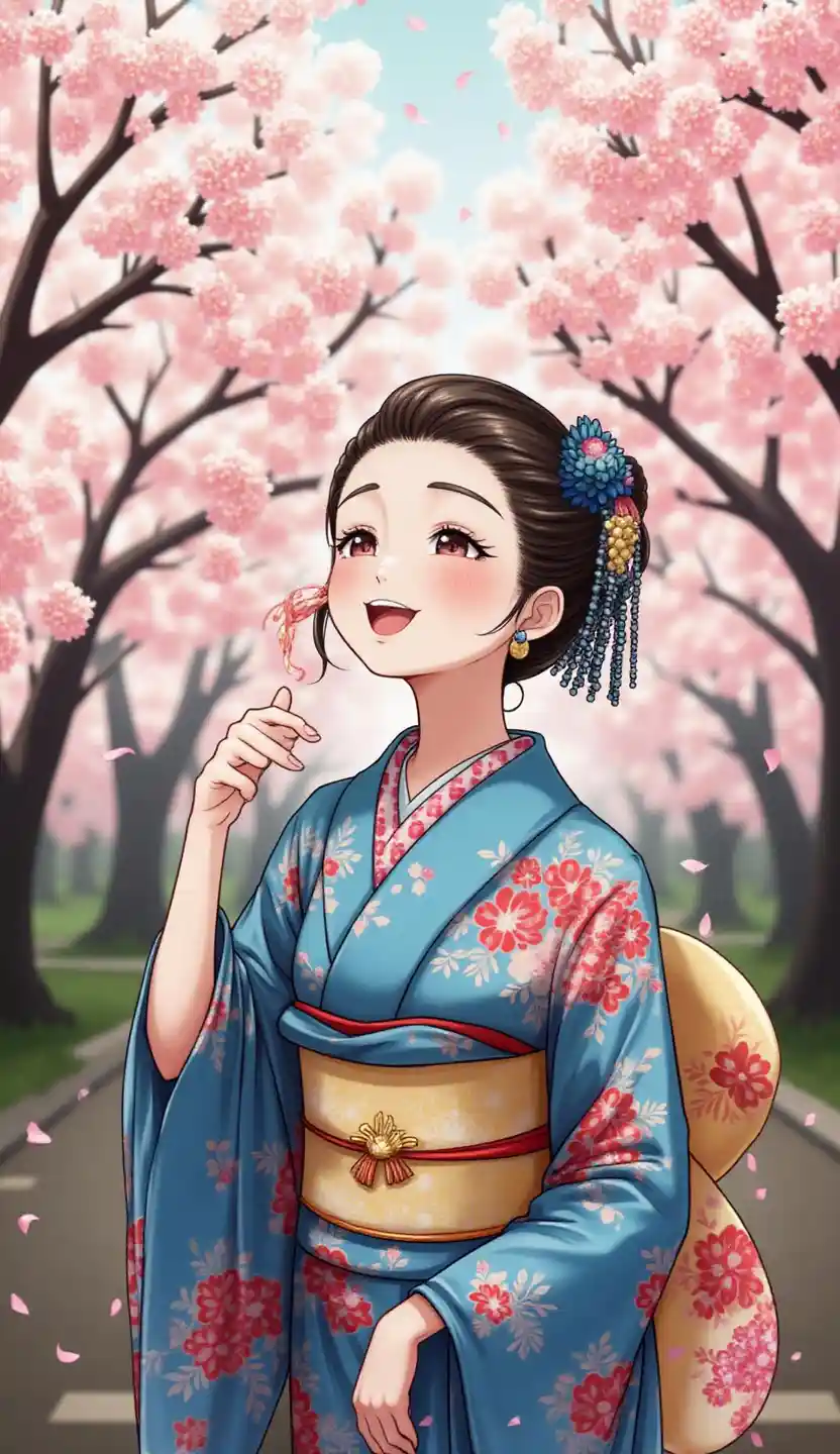 BentleyUne geisha admire les fleurs de cerisier dans le jardin, tout sourire, relève joyeusement la tête, des pétales sur le visage, entourée de branches de fleurs de cerisier, un c