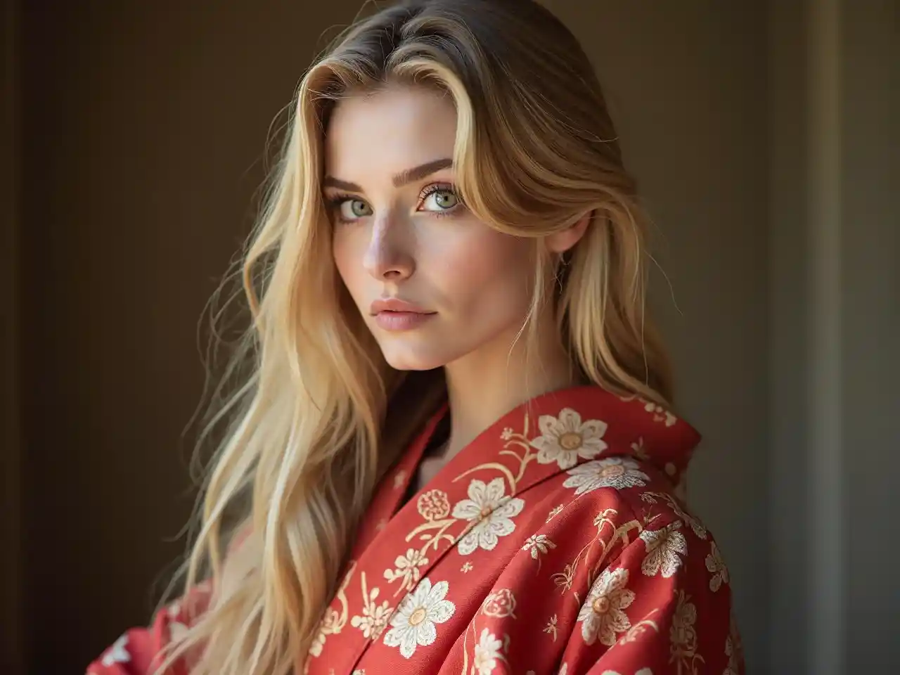 KinsleyUne Suédoise blonde doit avoir les cheveux longs et un œil marron en costume de geisha