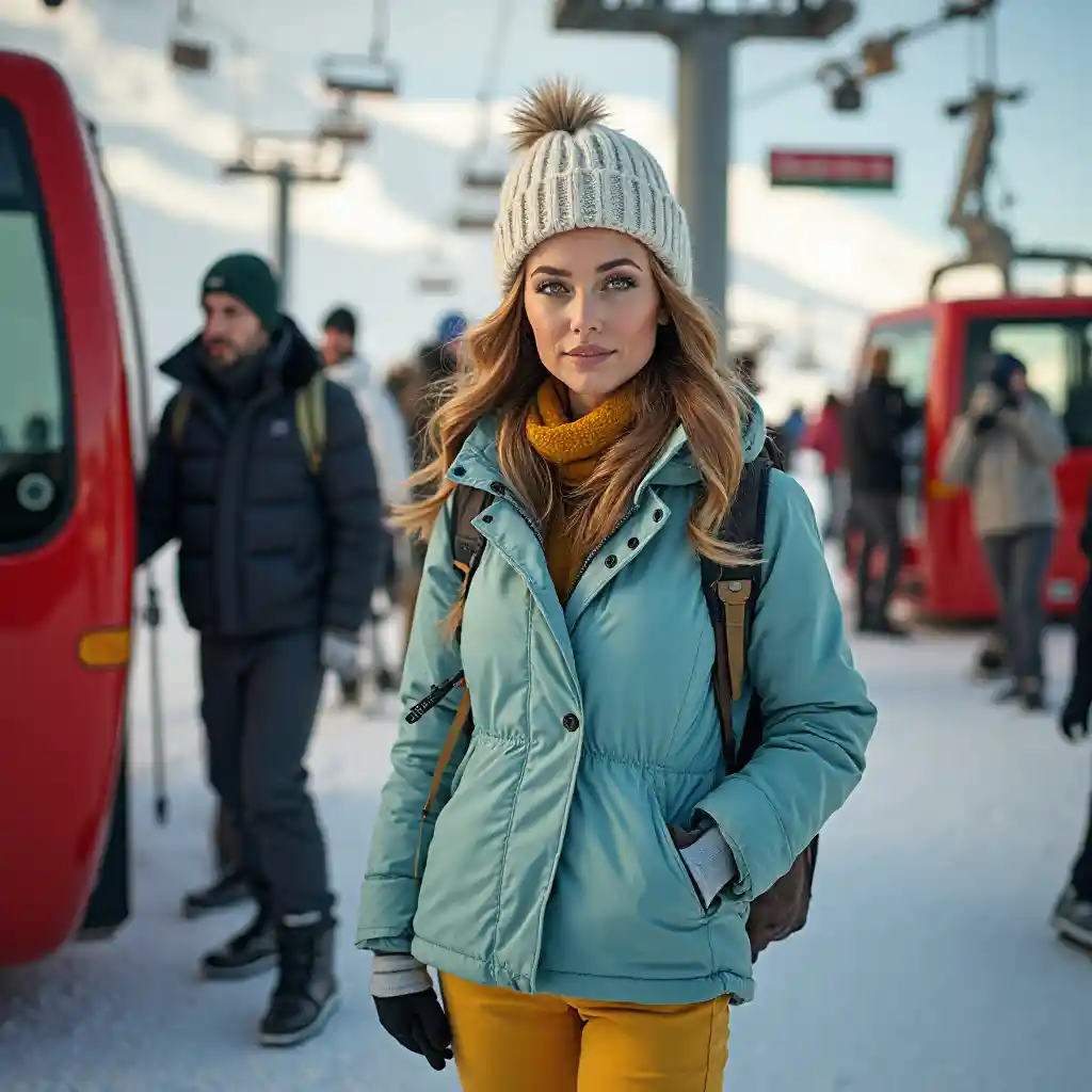 Photo Pro de beauté allemande accrocheuse, 21 ans, (yeux verts), (cheveux blonds cannelle), (sourcils voûtés), (visage magnifique en diamant), vêtu (parka bleu ciel) et (béret blanc), (pantalon de ski jaune) bottes noires, (carrosserie incurvée), alignée pour le tramway rouge, portant des skis et des poteaux, (super détaillé), (8k), ensoleillé, arrière-plan de la station de tram.