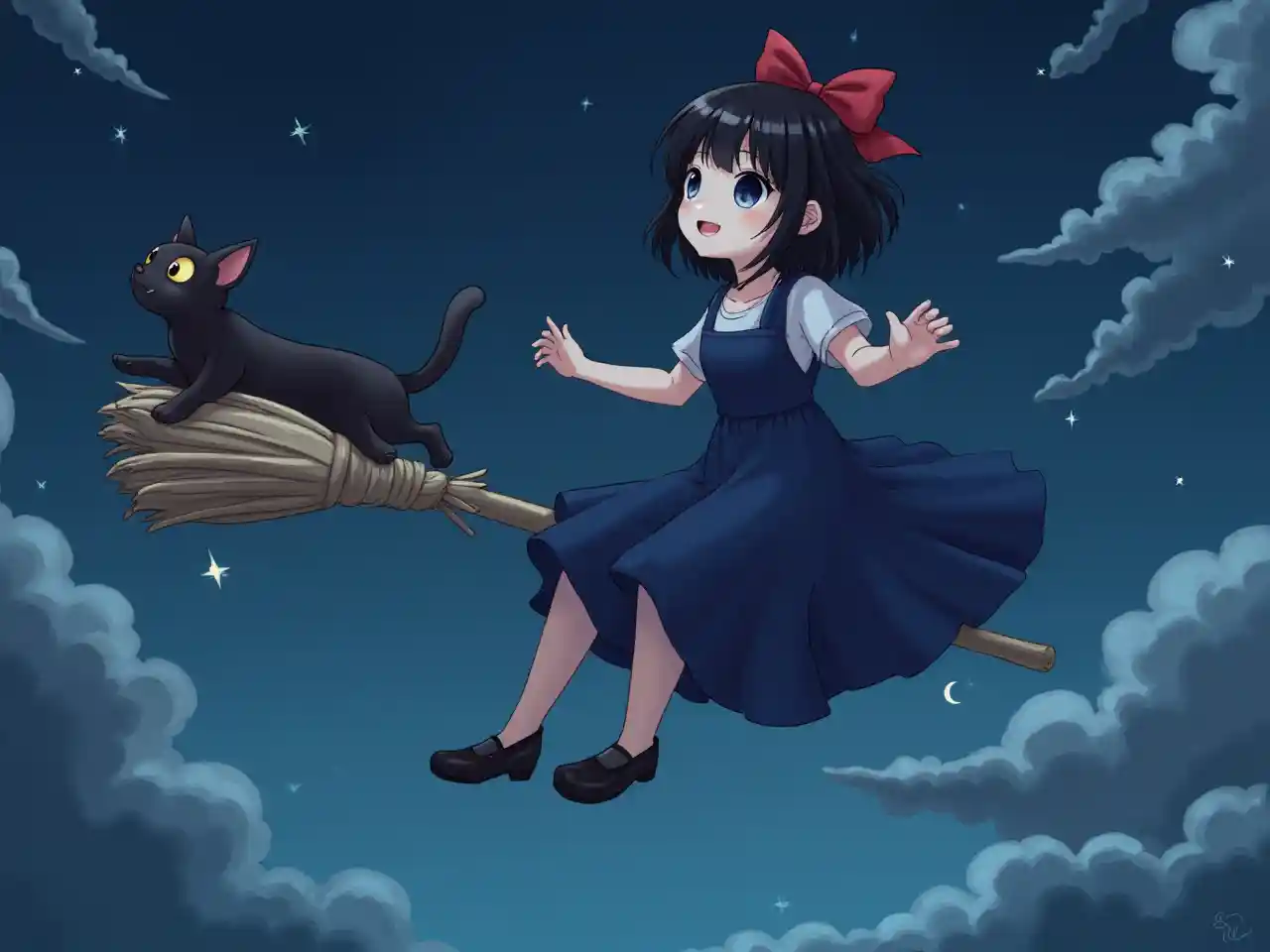 La jeune fille très blanche, cheveux courts noirs avec un nœud rouge sur la tête, porte une simple robe bleu foncé. Montée sur un grand balai, la jeune fille vole dans le ciel nocturne avec son petit chat noir