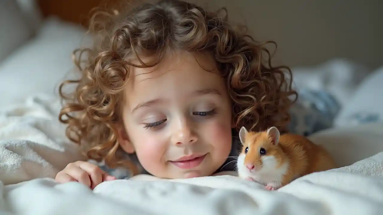 AdelineLa petite fille aux cheveux châtain clairs et aux yeux bleus se réveille dans son lit avec un mignon hamster marron et blanc à ses côtés