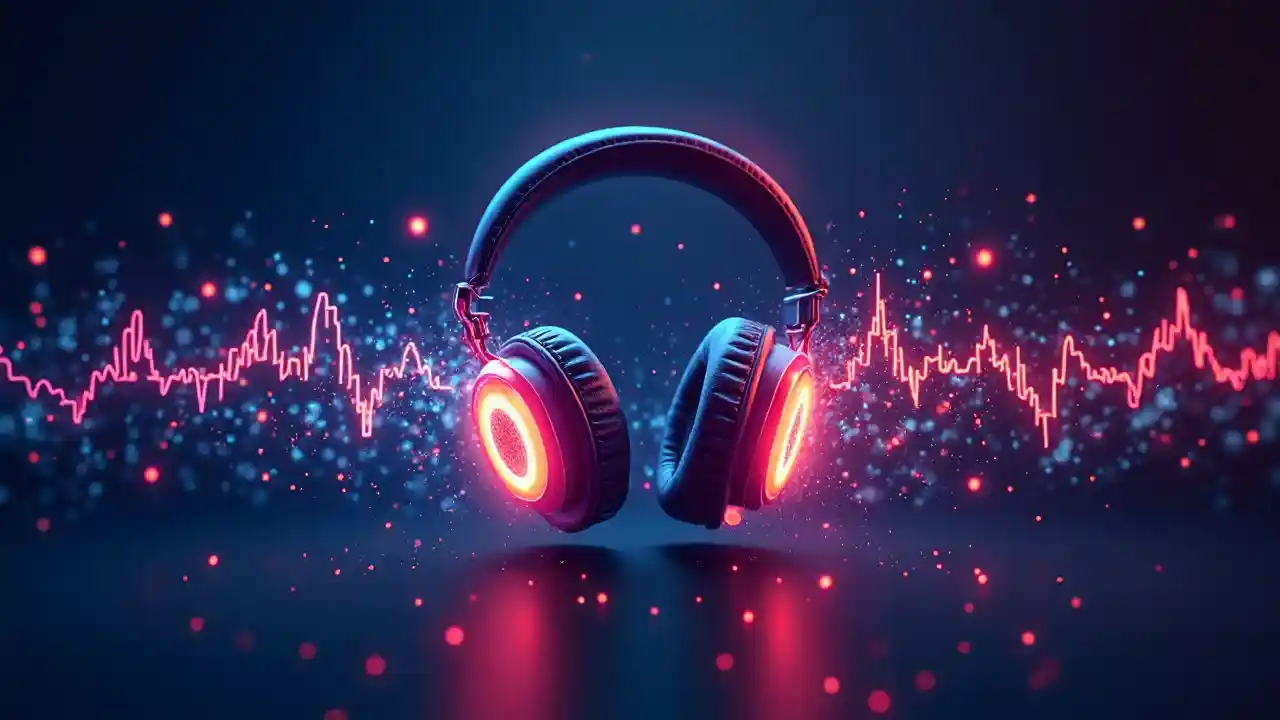 Design graphique d'un casque lumineux entouré d'ondes sonores et d'éléments musicaux