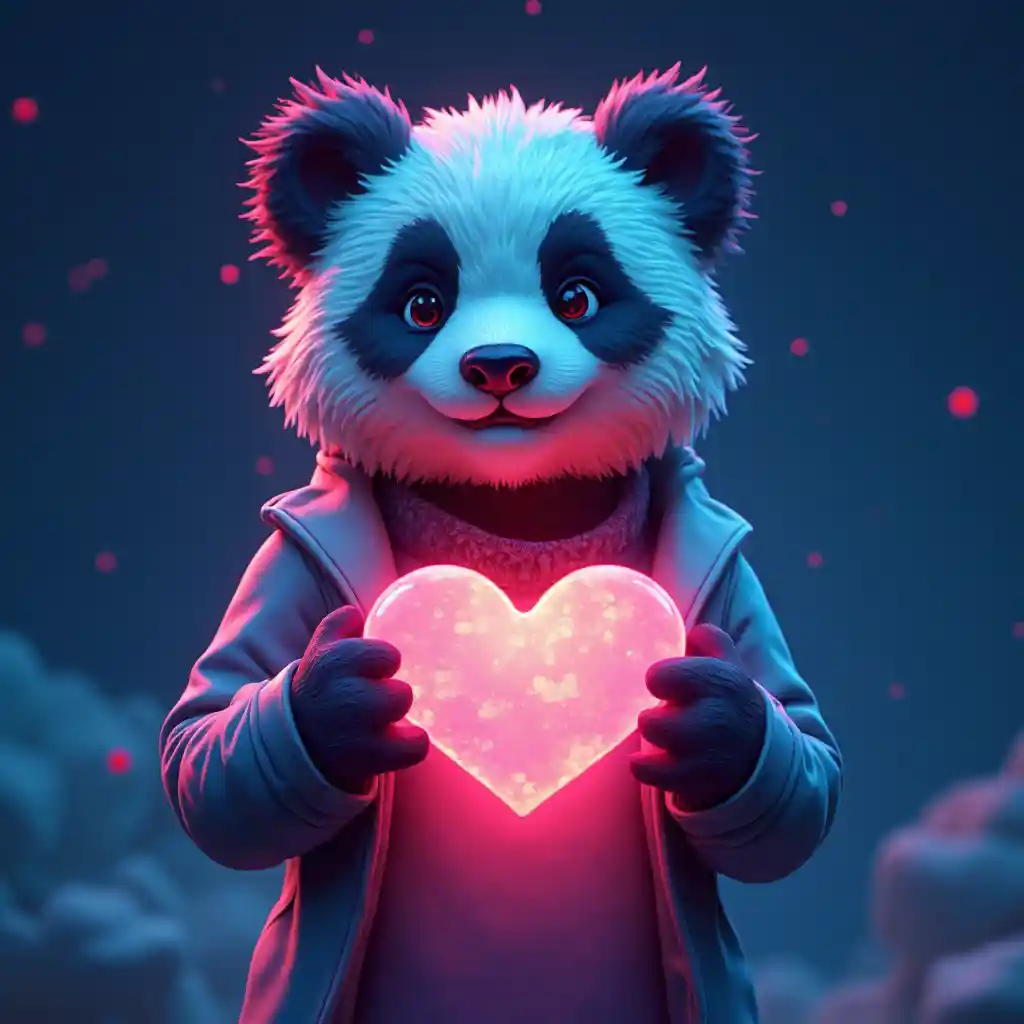 L'un ((((détails réalistes flottant et panda à la craie multicolore lumineux)), avec ses traits délicats et ses détails subtils, vêtu d'un ((style minimaliste, chemise large ouverte montrant un cœur parfaitement façonné sur la poitrine, le cœur dégage doucement une lumière)), posé avec confiance, comme s'il en tenait un ((coeur flottant, lumineux dans les pattes)), dans une fusion transparente avec (style Fortnite) (super réaliste, haute résolution), Déchargeant une illusion merveilleuse qui complète (l'arrière-plan de la nuit étoilée), le panda apparaît dans une silhouette vive, colorée et ludique, capturant l'essence de la fantaisie fantaisiste et devenant réaliste