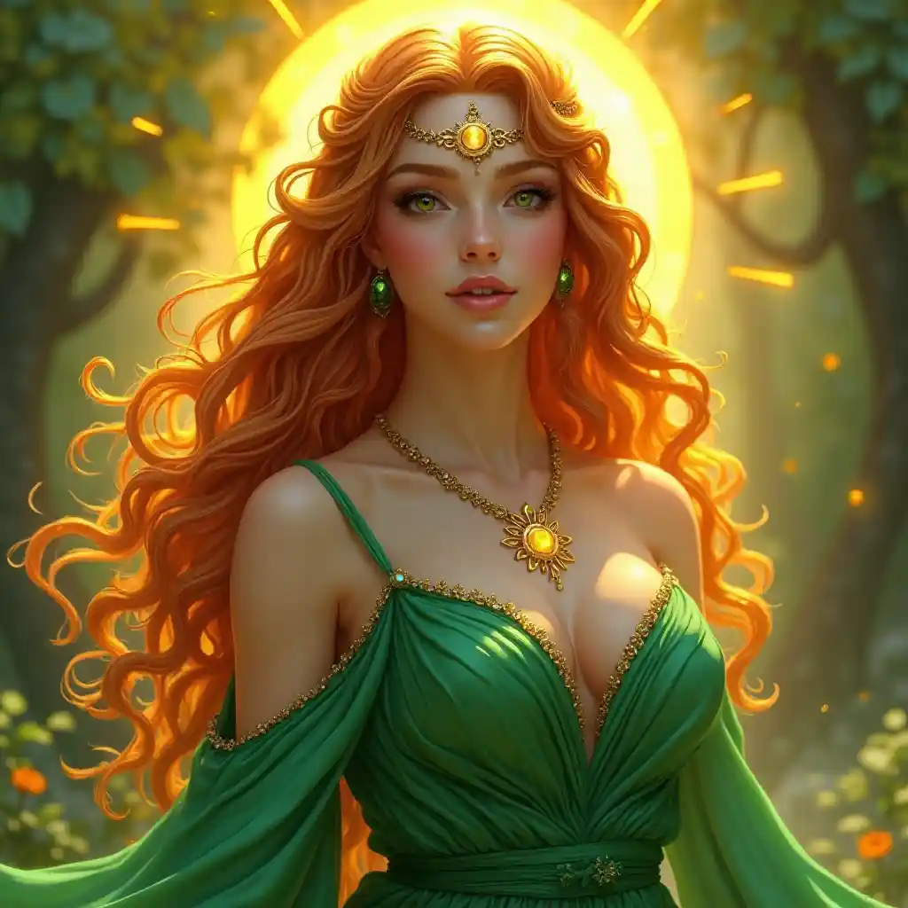 Dans une scène vibrante et éthérée, Macha, la déesse irlandaise du soleil, de la guerre, du combat, de la fertilité, du destin et des qualités divines de la nutrition, se dresse solennellement, dégageant la force, la détermination et la chaleur maternelle. Sa peau dorée rayonnante rayonne intérieurement, symbolisant son lien avec le soleil et son rôle d'éleveuse. Ses cheveux épais, bouclés et roux s'affaissent dans le dos, dessinant son visage en forme de cœur, décoré de hautes pommettes, d'un petit nez et de lèvres pleines, et ses courbes se transforment en un sourire tendre et sympathique. Ses yeux d'émeraude perçants brillent d'intelligence et de bonté. Elle portait une élégante robe vert émeraude brodée de motifs celtiques complexes, représentant son lien avec le monde naturel et son rôle de reine. Il y a un cercle doré délicat et magnifique sur son front avec un petit bijou étincelant, symbolisant la sagesse de son mari Kriom Hetan et leur union harmonieuse. En arrière-plan, une aura subtile, pétillante, laissant entrevoir la prospérité et l'abondance qui ont fleuri sous son règne.