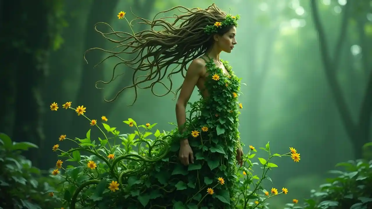 Une déesse mystérieuse enroulée dans une vigne verte lumineuse