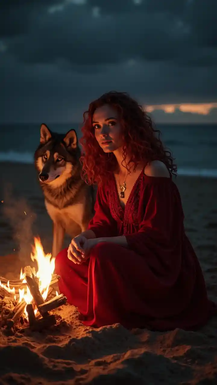 Maman La déesse Wiccan, vêtue d'une mode bobo rouge, ressemble à l'actrice Brigid Brannagh, cheveux roux bouclés. Il fait nuit. Un loup gris est assis avec elle. Elles sont illuminées la nuit par le grand feu de joie de la plage,