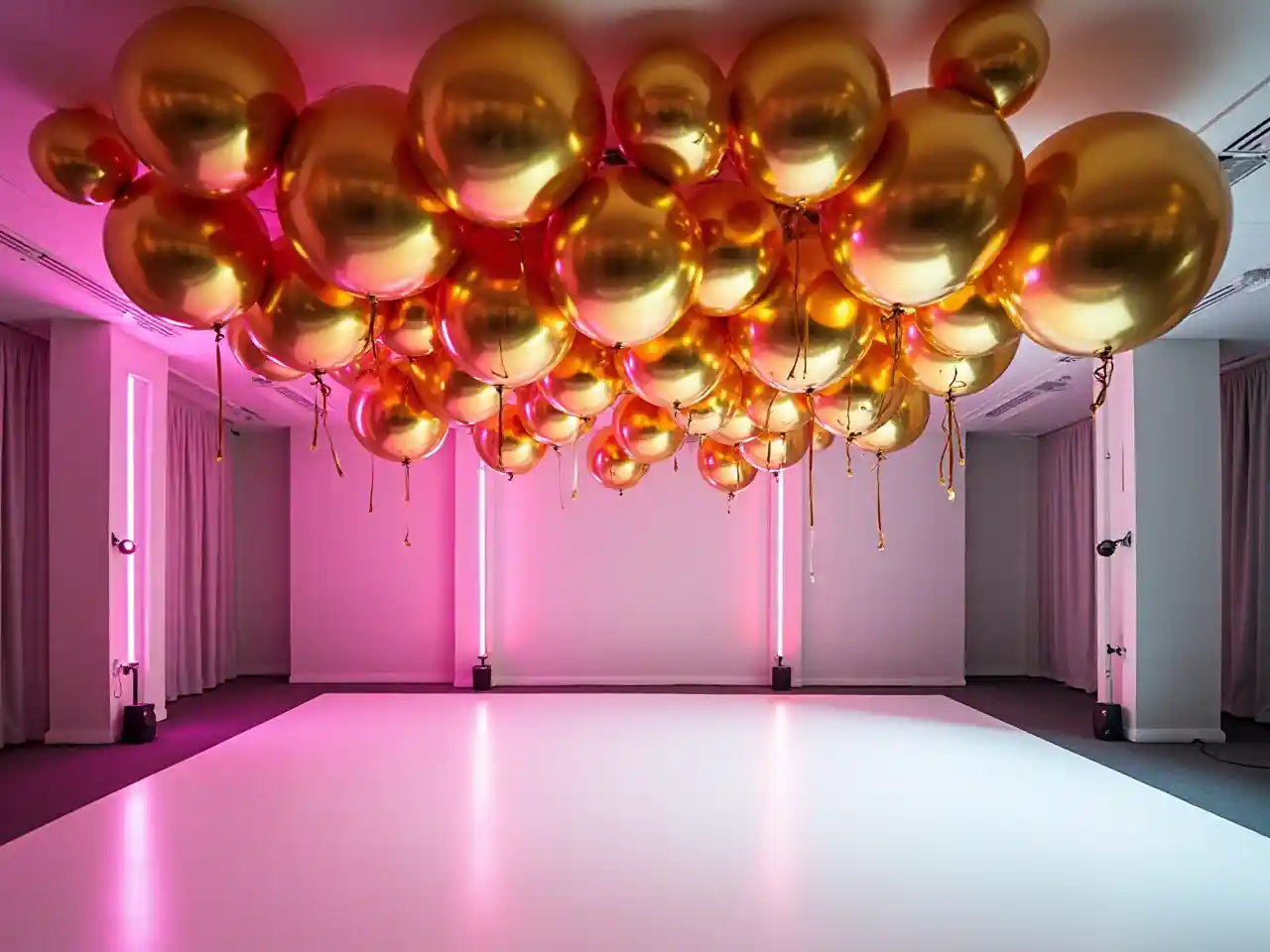Installation de ballons au plafond au-dessus de la piste de danse blanche, uniquement de très grands ballons métalliques dorés avec des lampes à tube astro de néon rose suspendues. Pas beaucoup de lumières