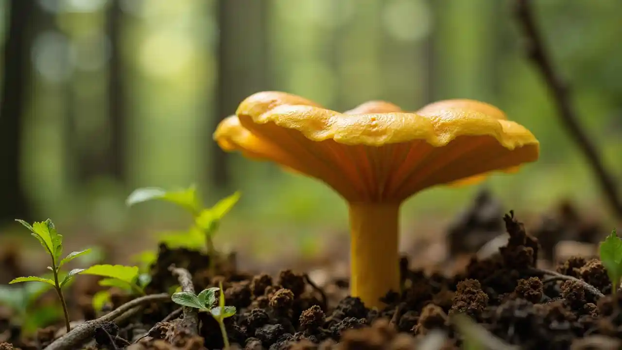 HarrisonMacro photo d'un champignon de chanoine doré, jaune, forêt