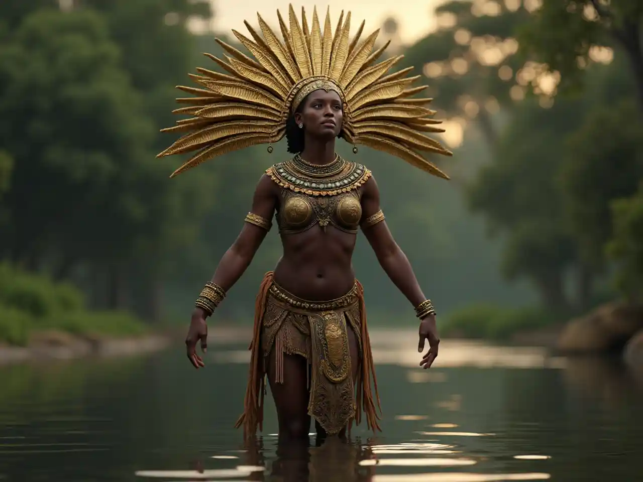 GraceUne reine africaine debout sur l'eau, coiffe d'or, style zbrush, portrait clair-obscur, costume de détail, image uHD, ForestPunk, art bamileke, portrait occidental