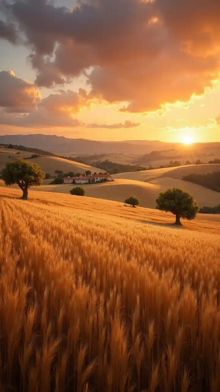 Le champ doit être vaste, recouvert de blé doré haut, se balançant doucement avec la brise. Quelques oliviers patchés et anciens, dont les branches rugueuses s'étendent vers le ciel et parsement les montagnes et les rivières. Le ciel au-dessus devrait être un magnifique mélange d'oranges chaudes, de rose et de violet lumineux, et le soleil levant vient de jaillir à l'horizon. Blottis dans les collines ondulantes au loin, vous pouvez reconnaître la silhouette d'une charmante ferme toscane dont le toit en tuiles rouges brille dans les premiers rayons de soleil de l'aube. L'ambiance générale de l'image doit susciter un sentiment de paix et de sérénité et incarner la beauté pastorale de la campagne toscane.