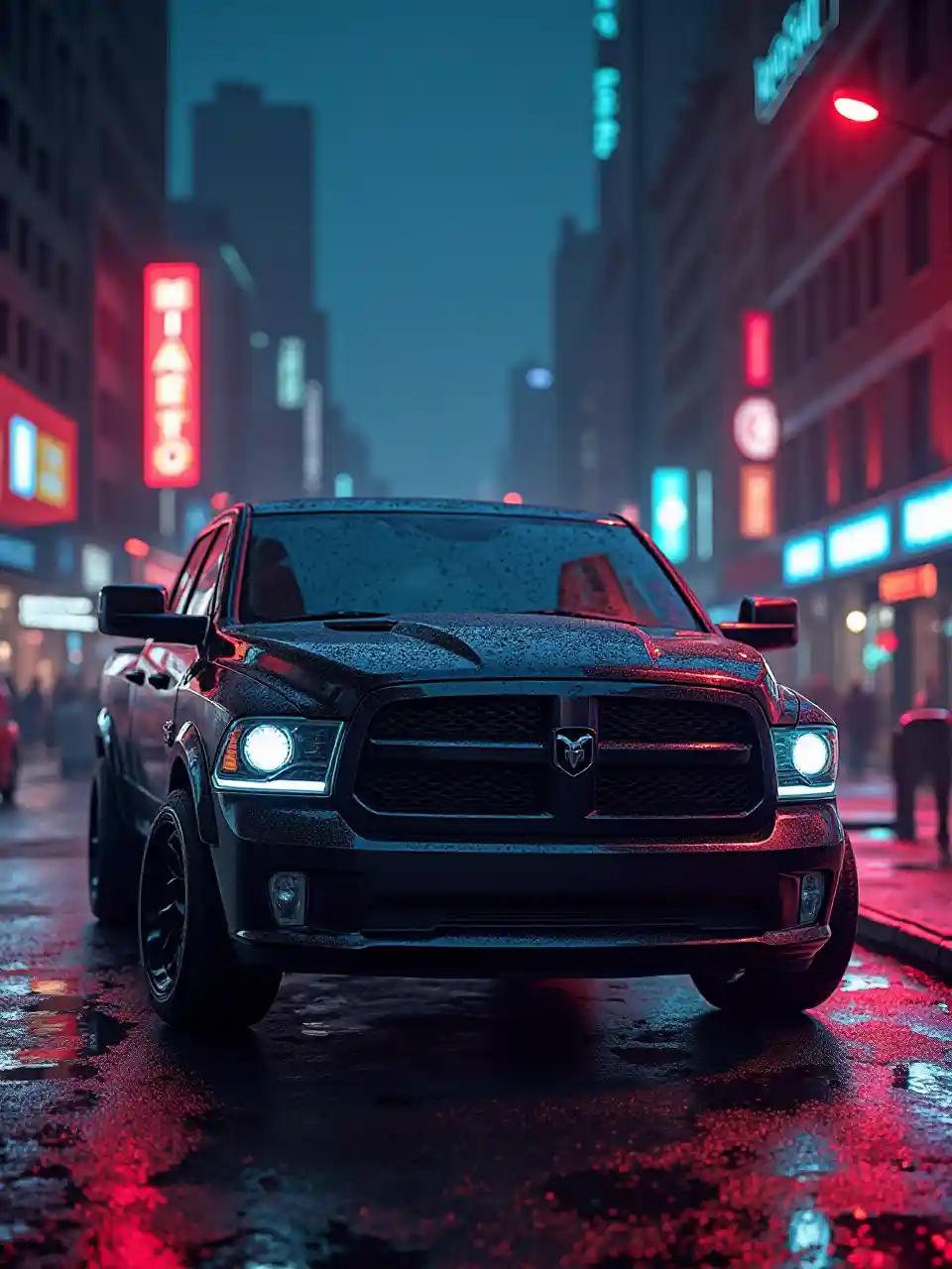 Black Dodge Ram 1500 à Gotham City avec des néons