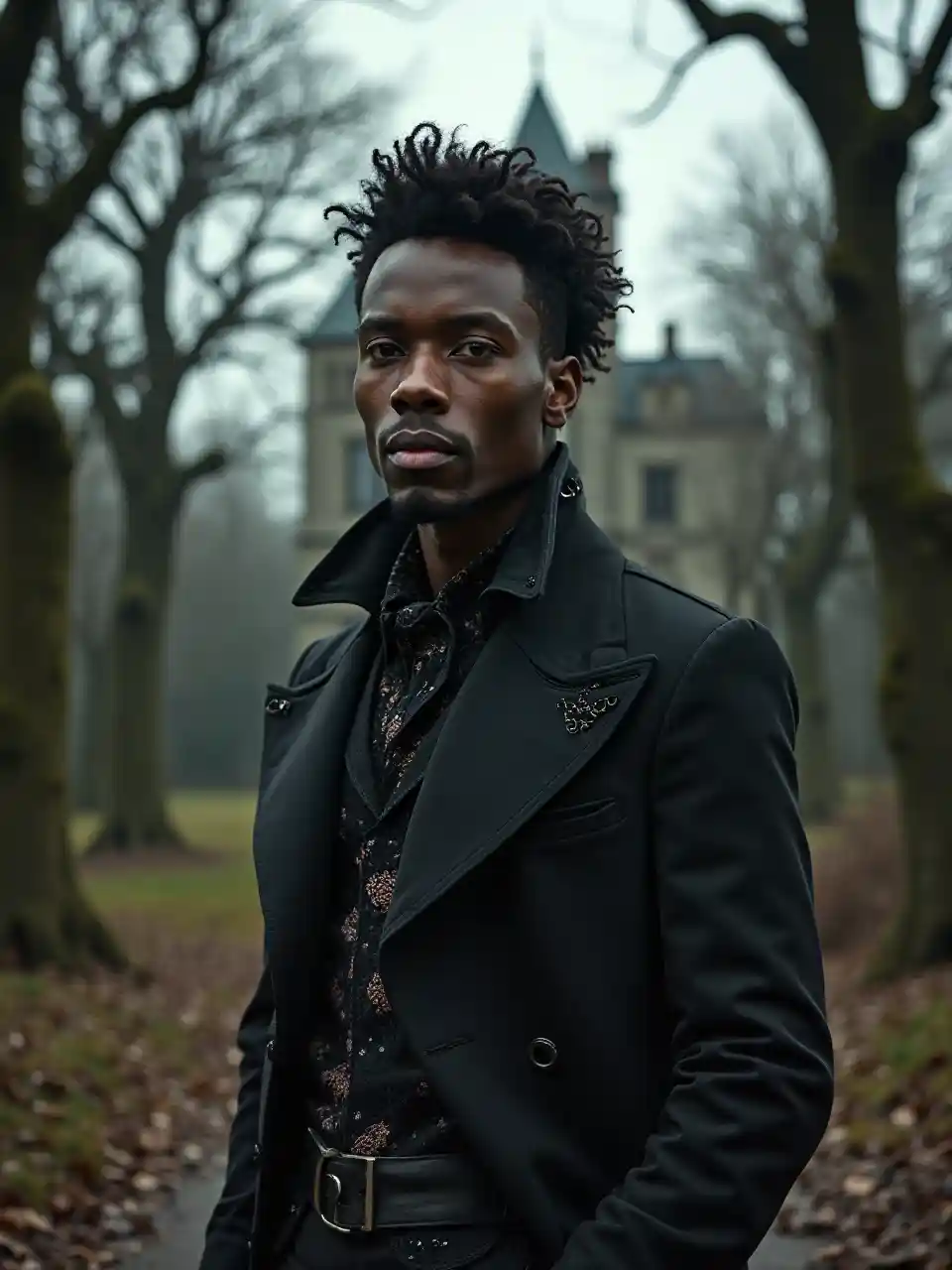 Un homme noir accrocheur se tient dans la beauté inoubliable du paradis gothique, et son apparence domine la scène avec un mélange charmant d'élégance et de mystère. Il portait une tenue exquise mélangeant mode moderne et style victorien, un manteau brodé exquis à col roulé et un pantalon découpé avec un accent de cuir subtil. L'arrière-plan est un paysage dramatique, des arbres centenaires déformés dessinent un ciel nuageux et les ombres projetées dansent sur un manoir en pierre abandonné à l'arrière-plan. Son regard, tendu et charmant, cache des secrets séculaires, et une brise bouleverse ses cheveux, ajoutant une touche de séduction sauvage à l'atmosphère éthérée. La juxtaposition de romance sombre et de style raffiné crée une élégance gothique inoubliable et une image de charme intrigante.