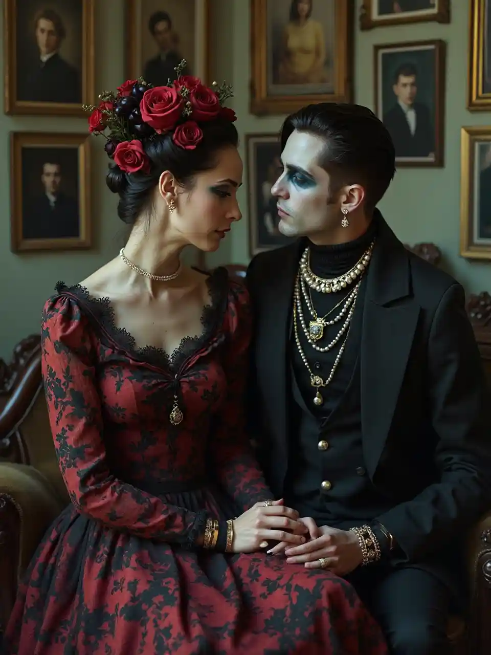 Un corps de femme et un homme démoniaque dans une salle rétro, avec ses photos accrochées au mur, des fleurs de maquillage gothiques sur la tête, des vêtements décorés d'une variété d'accessoires uniques étonnants, de minuscules colliers de perles, de boucles d'oreilles et de bracelets luxueux. Maquillage gothique