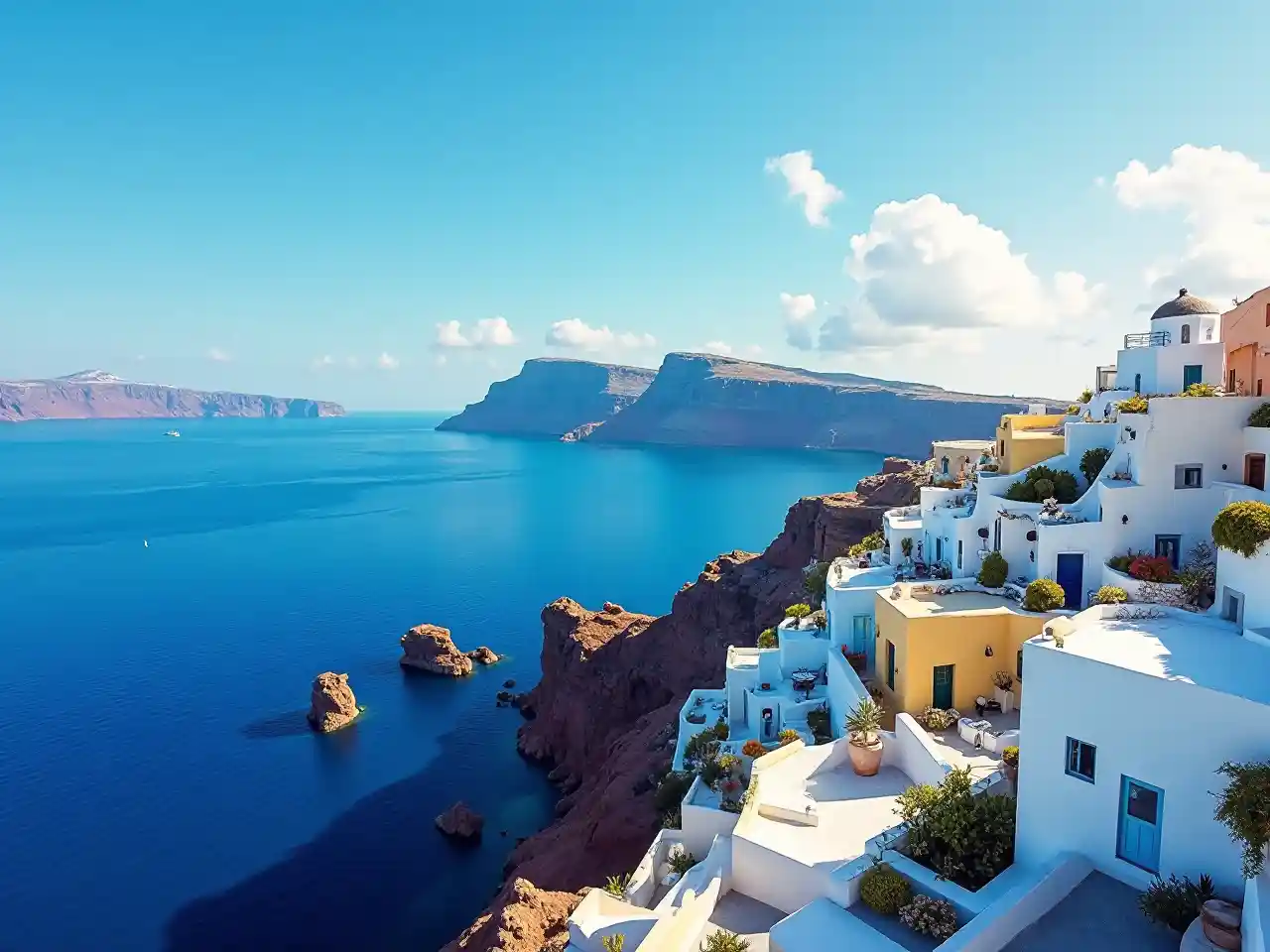 Paysage Île grecque de Santorin, couleurs vibrantes, détails élevés, mer bleue, montagnes