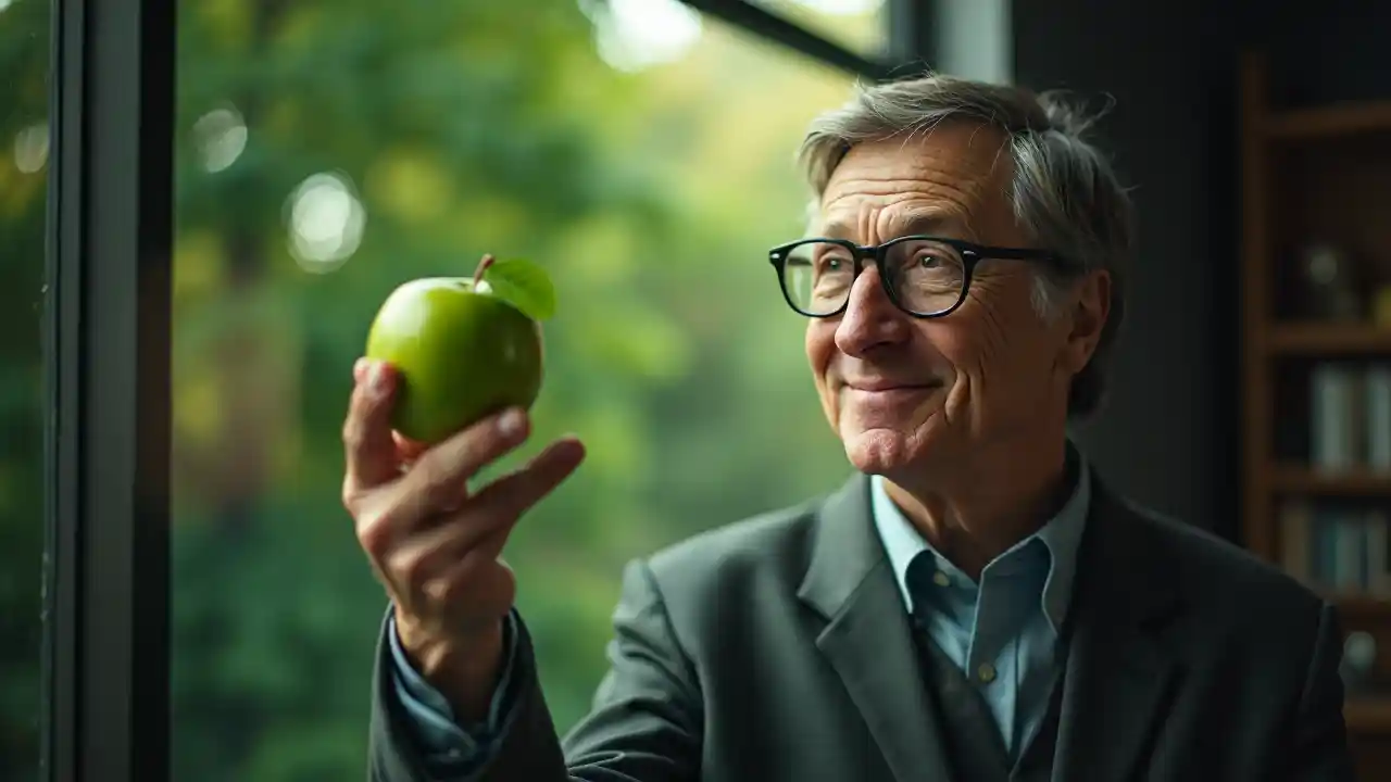 Bill Gates jette une pomme verte à la fenêtre, des couleurs vives et saturées, des détails élevés, une mise au point nette, des lumières dramatiques, des détails incroyablement hauts
