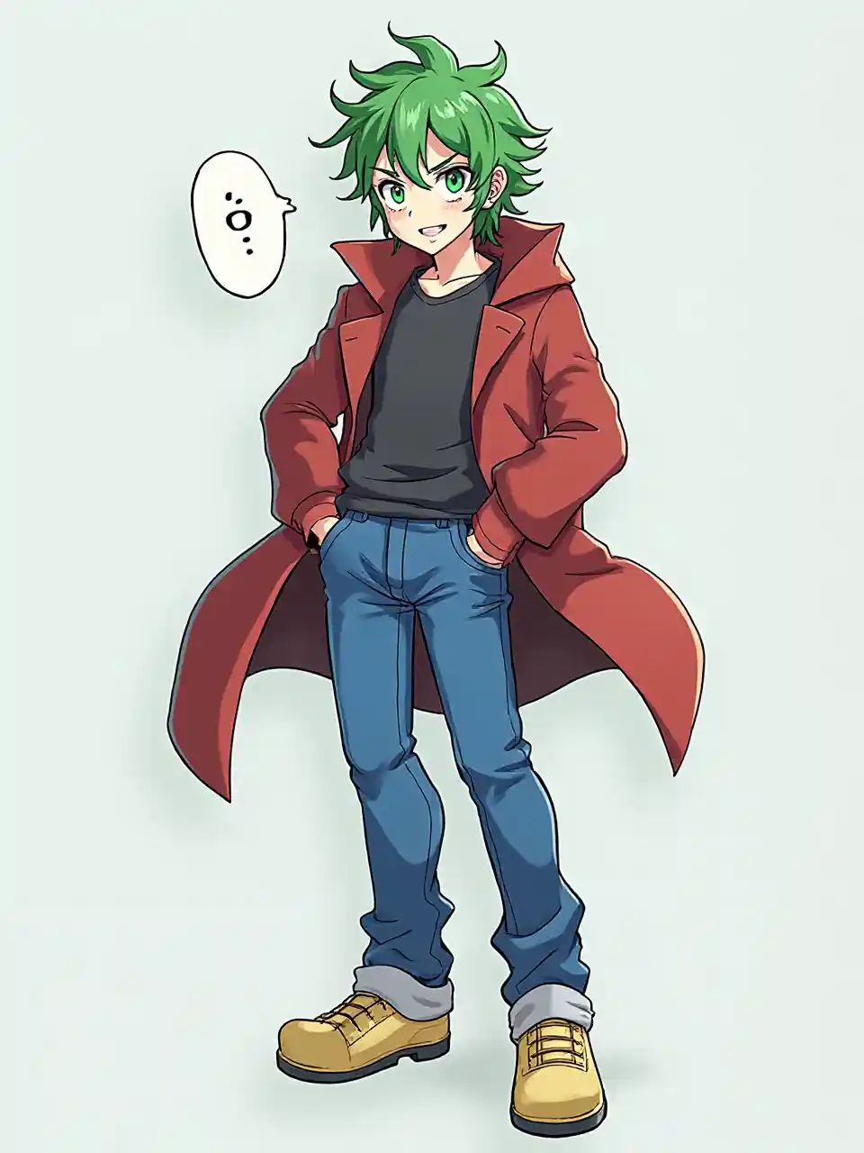 ANIME Garçon Cheveux verts Jean lumineux bleu avec manteau rouge, oreilles, chaussures jaunes