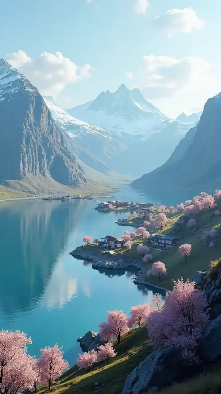 Une image du paysage vert de 2100 est générée, une ville moderne sur le lac et le rivage, des arbres en fleurs printanières entourent les icebergs et des glaciers et des rivières se jettent dans le lac