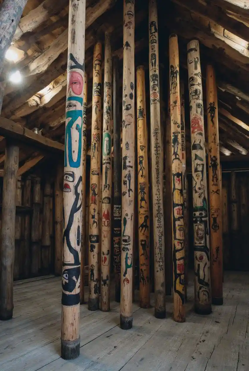 Une longue maison Haïda au Canada, avec des poteaux remplis de spiritueux.