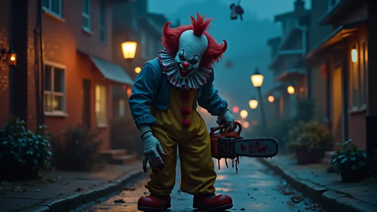 Clown tueur et horreur nuit de rue Thème d'Halloween Style Disney Pixar avec tronçonneuse sanglante Personnage unique Image du corps entier Vêtements d'Halloween