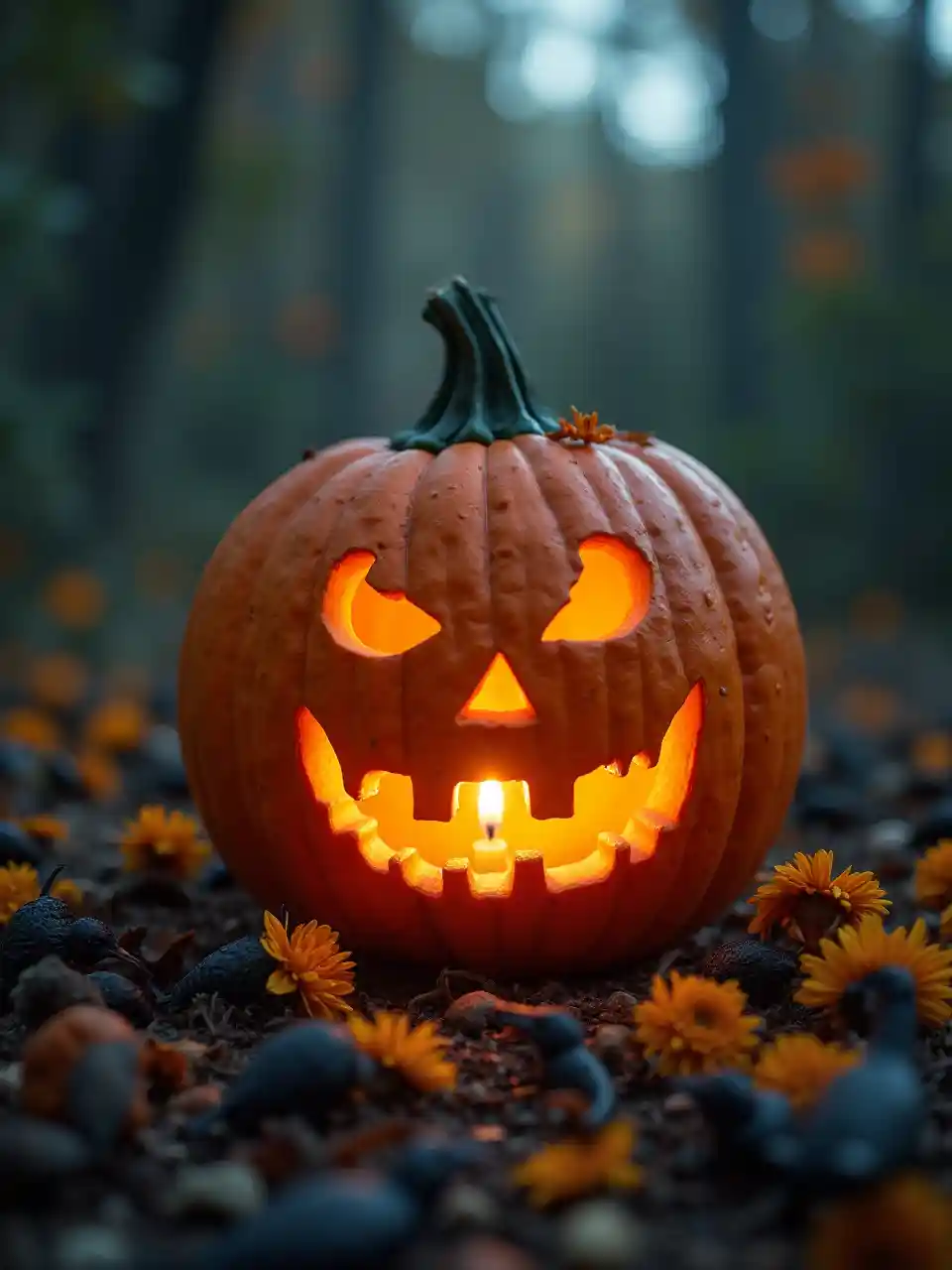 La citrouille d'Halloween utilise la lumière de la bougie de l'intérieur, la lumière de la bougie entoure les oiseaux noirs morts, les insectes et les chauves-souris dispersés avec des fleurs mortes, point focal de profondeur de scène peu profonde