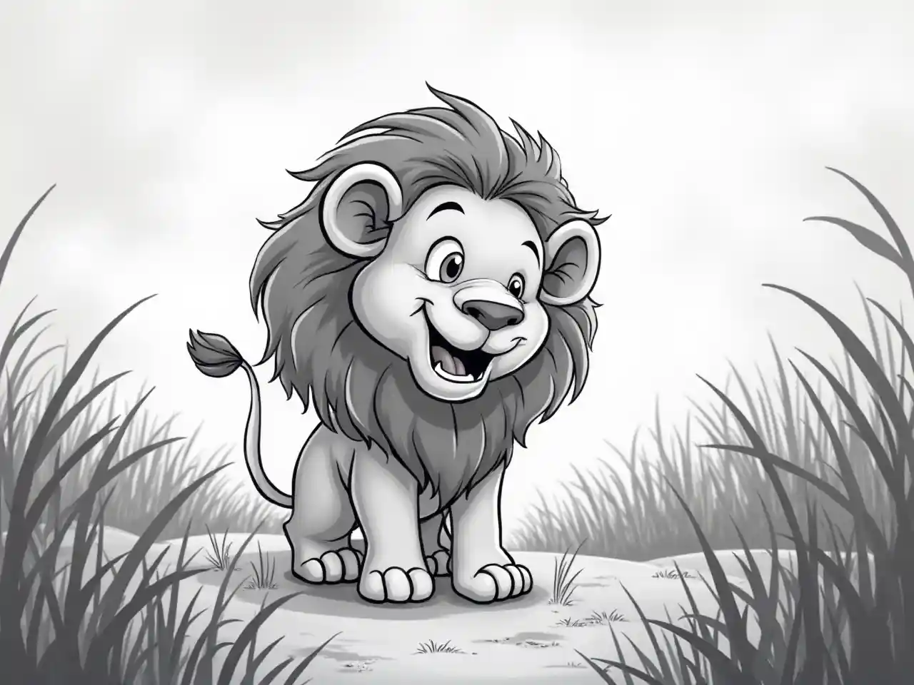 Dessin animé noir et blanc d'un lion fantasque et heureux
