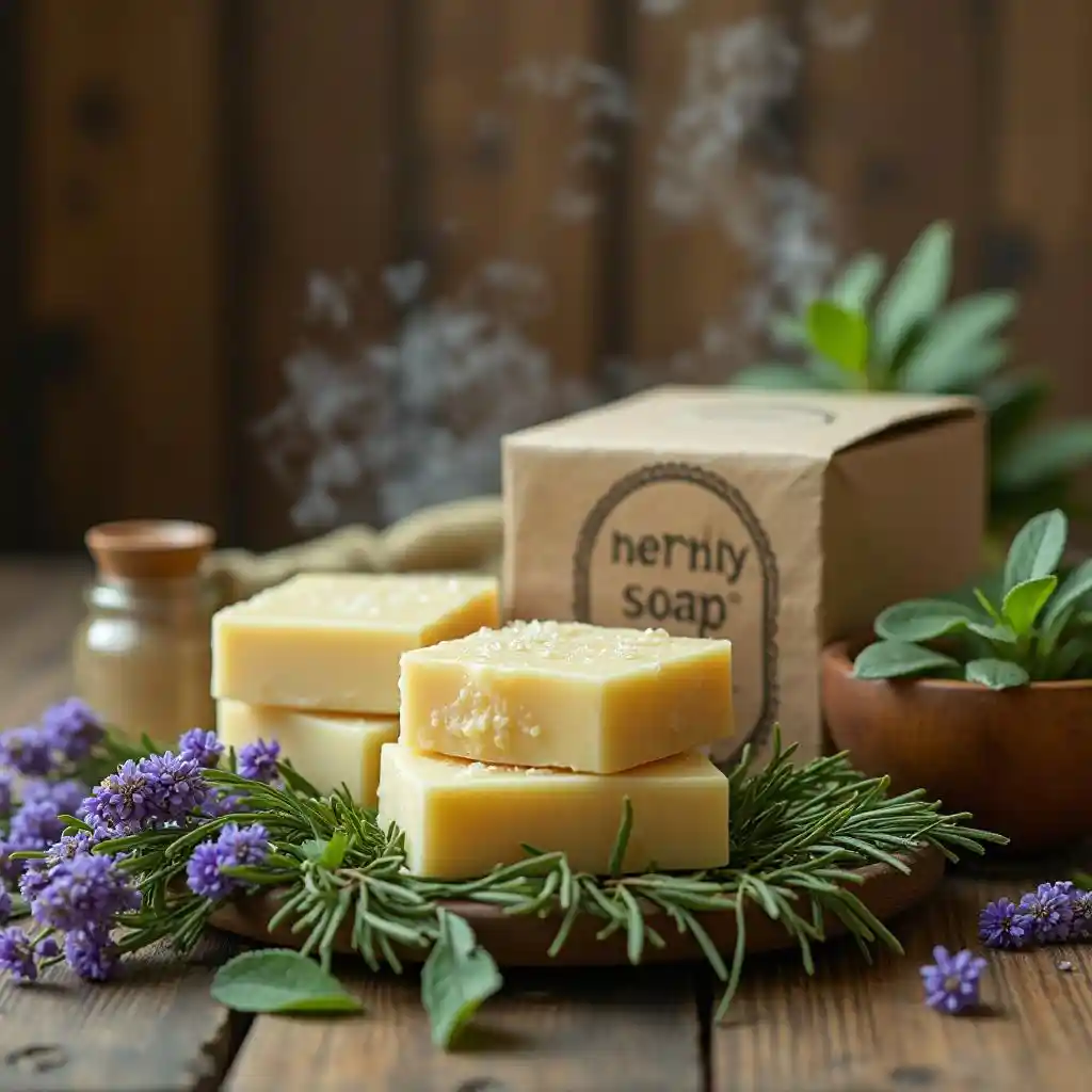 Image publicitaire élégante d'un savon de bain naturel à base de plantes fait maison. Les décors se caractérisent par un fond rustique en bois, avec une lumière douce et nature. Les bandes de savon sont délicatement placées sur le lit de lavande, de romarin, de menthe et d'autres herbes fraîches, et il y a un petit bol en bois rempli d'huiles essentielles à côté. Les gouttes d'eau sur le savon suggèrent fraîcheur et pureté. L'effet vapeur subtil rehausse l'ambiance apaisante, thermale. L'emballage est respectueux de l'environnement, enveloppé dans du papier kraft étiqueté à la main, soulignant sa composition organique et sans produits chimiques. L'ambiance générale est calme, naturelle et luxueuse.