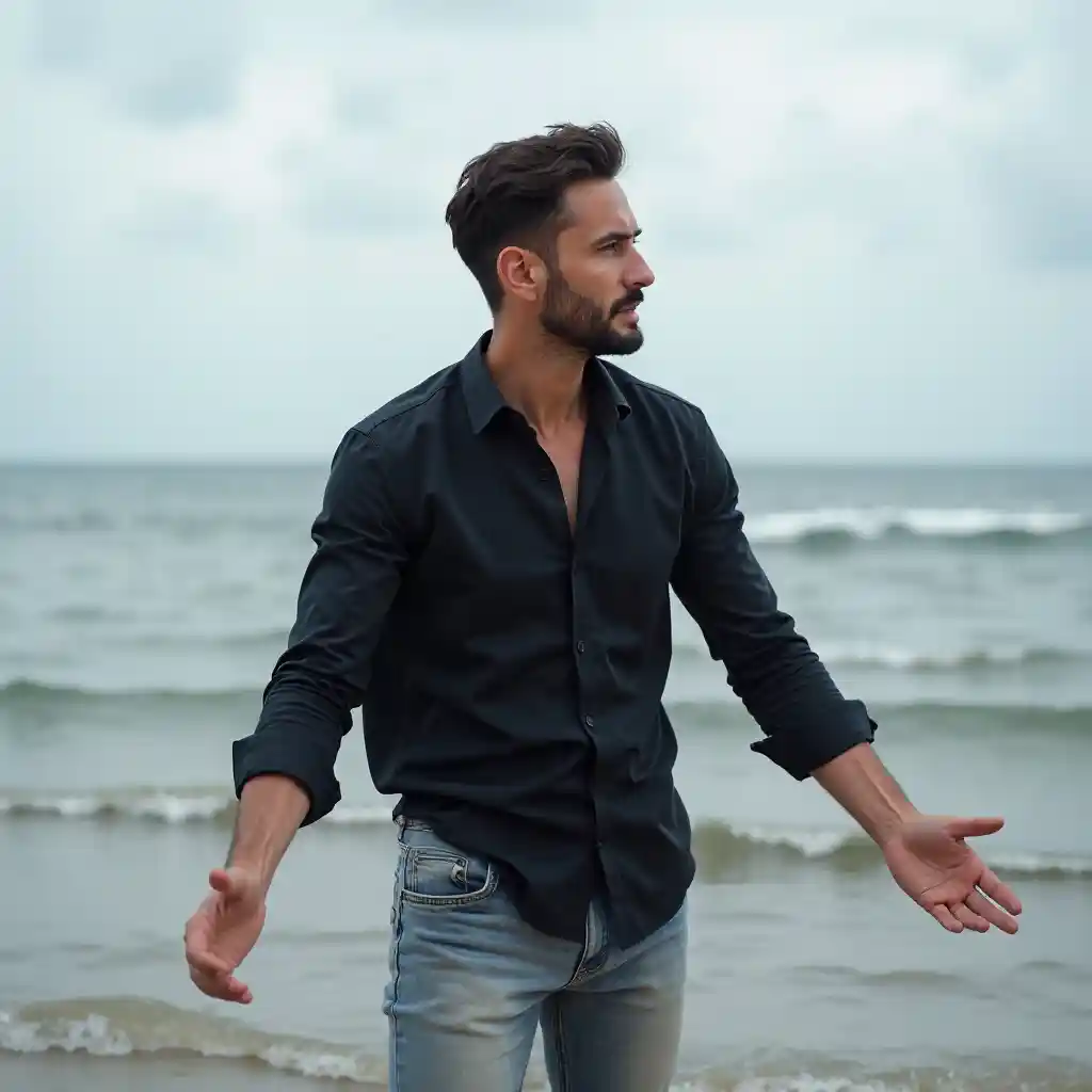 LucasLe beau héros vêtu d'une chemise foncée et d'un jean clair est d'humeur triste. Debout au bord de la mer, les mains ouvertes, pour donner la meilleure image vibrante possible
