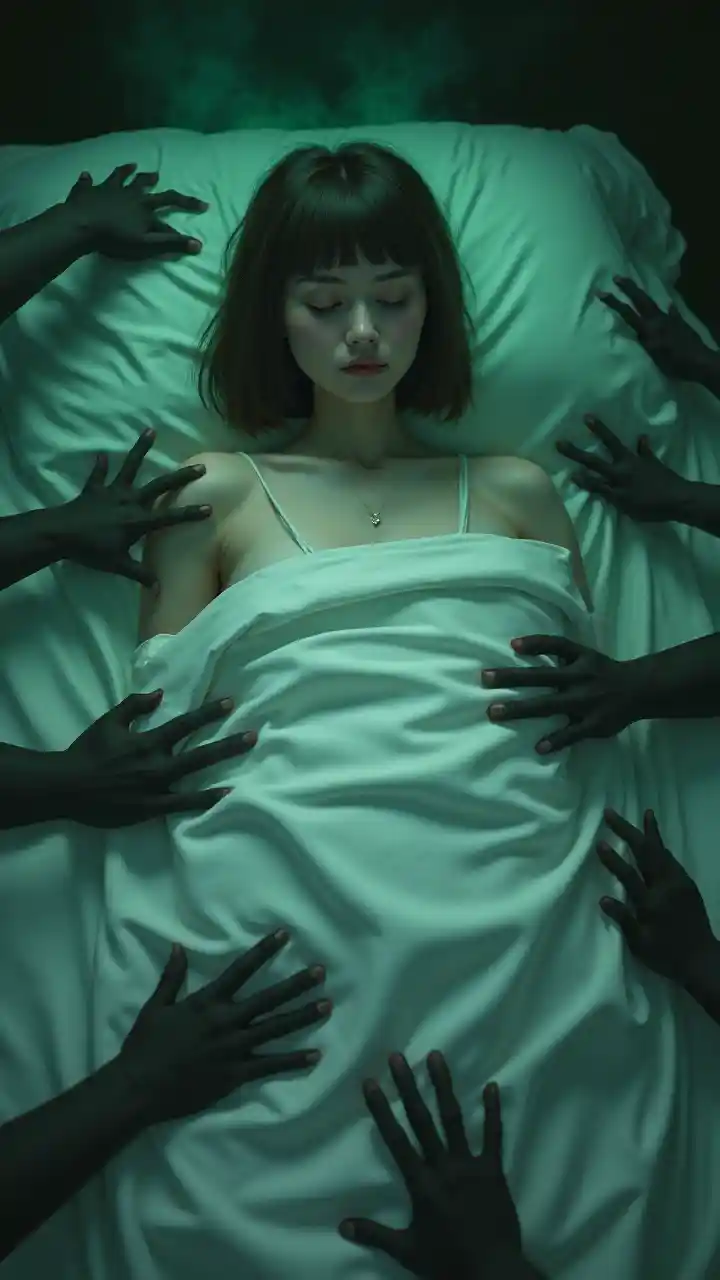 Ultra-réaliste, corps entier, large, une femme, cheveux de bob courts et droits, frange, cheveux bruns, vêtue d'une jupe de couchage blanche, les yeux fermés, dormant sur un lit blanc drap, huit mains monstres noires lui tendent la main sous le lit, mains terrifiantes, la lumière verte brille de derrière le lit, la fumée noire sort du lit.