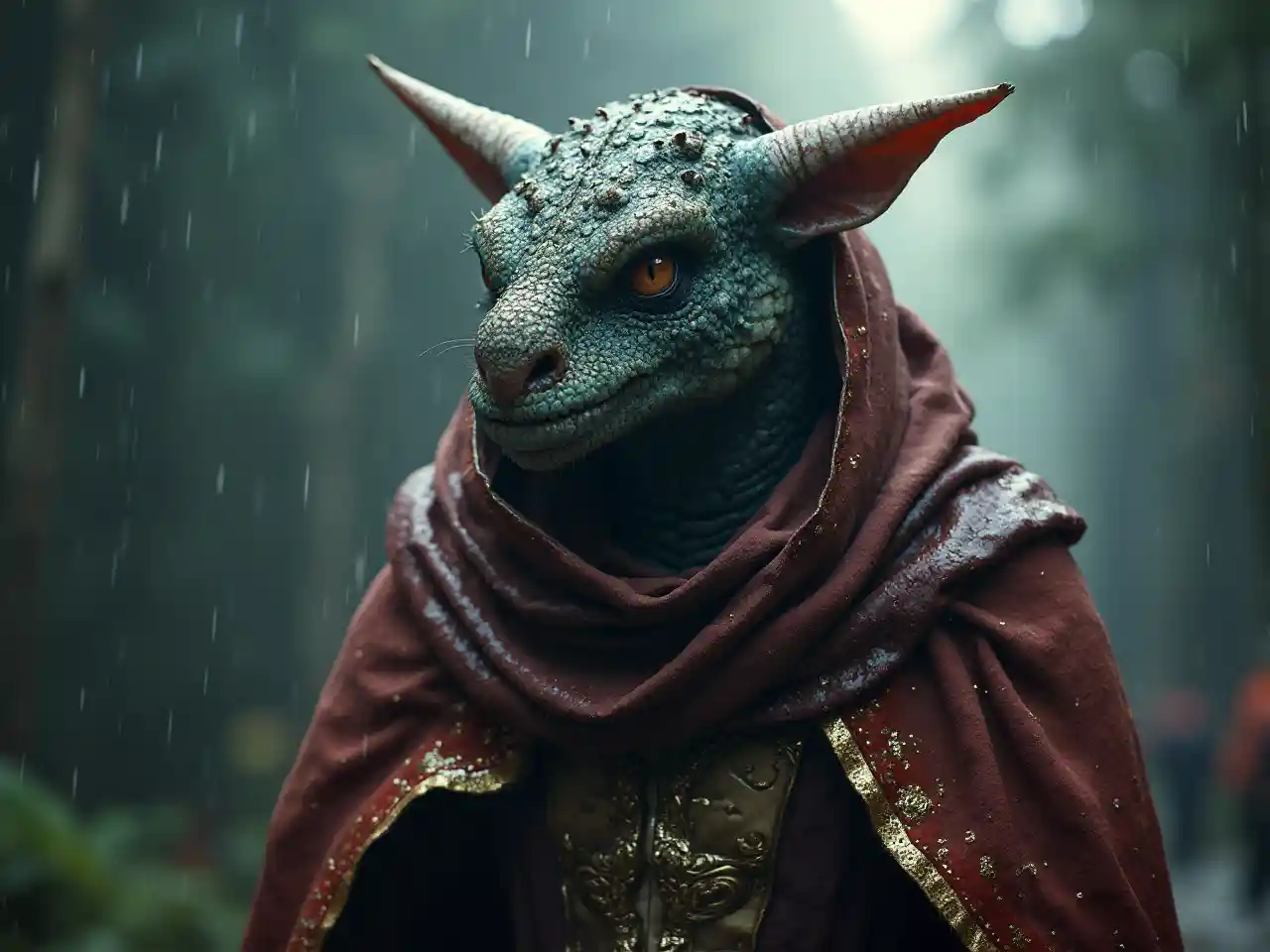 Anthropomorphe ultra-détaillé Targarian vêtu d'une robe étincelante, ultra-réaliste ultra-détaillé, sous la pluie, composition époustouflante, ultra-sensuel, éclairage de film épique, résolution 8k, photographié sur Hasselblad H6D-400c multi-objectifs