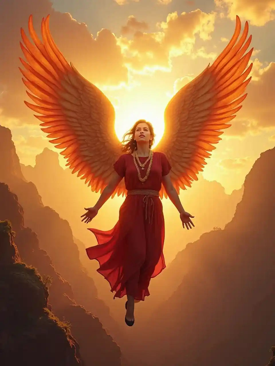 Les anges de l'amour volent dans le ciel, en vue du corps entier, ultra-réalistes, en or rouge, dans un style magique. Vives positives, explosion d'énergie en arrière-plan, lumière dans le ciel, soleil, lumineux, brillant, merveilleux, épique, héros, visage latino-américain très détaillé, visage parfait Regarder vers l'avant, montagne péruvienne Machu pichu, visage droit, yeux parfaits