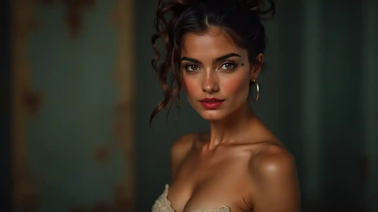 YamyImage de qualité, une jolie jeune indienne de 22 ans, légèrement bronzée, chignon en désordre, rouge à lèvres, buste moyen, lumière dramatique, fond flou