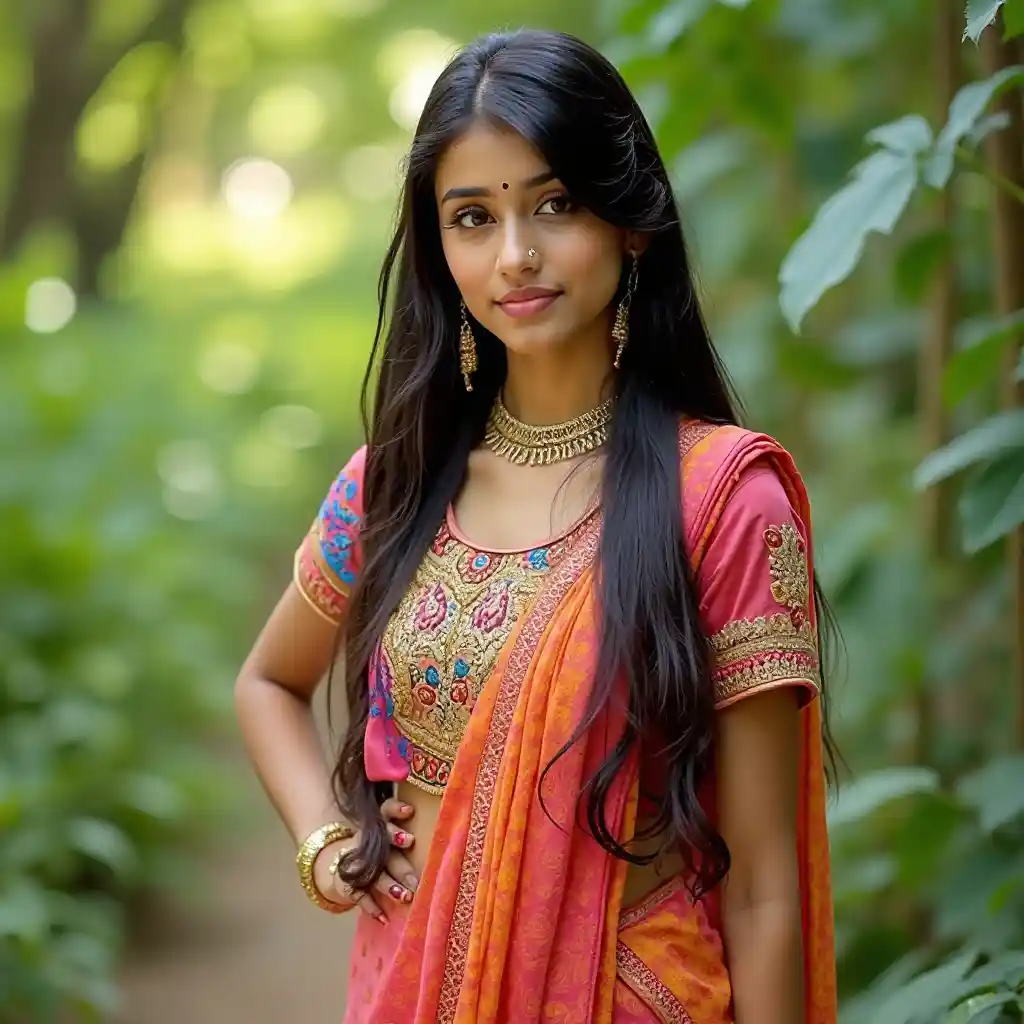 Une jeune mannequin indienne aux longs cheveux noirs et vêtue de vêtements traditionnels énergiques, pose élégamment dans un environnement extérieur. Le fond est caractérisé par une verdure luxuriante et un éclairage naturel doux, capturant sa confiance en soi et sa beauté