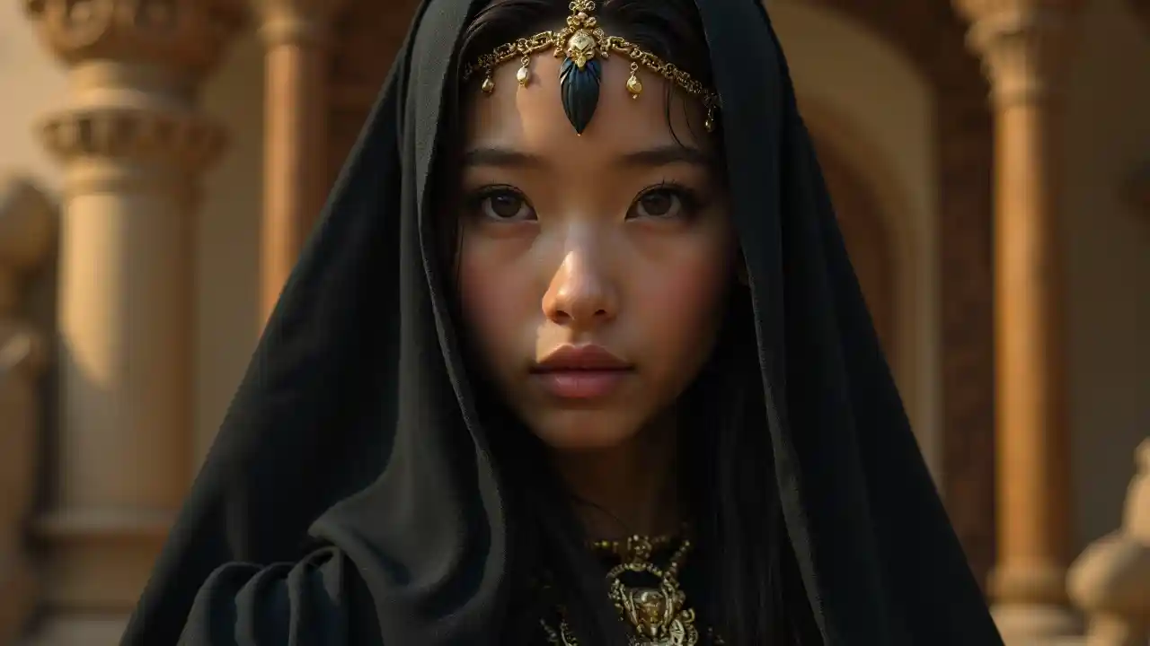 Des filles indonésiennes d'origine asiatique ultra-réalistes et ultra-détaillées avec une cape noire à la mode arabe avec des photos d'oiseaux noirs plantées sur la tête. Contexte du royaume ottoman de la Renaissance, photos réalistes, bijoux dorés, détails fractaux brillants et ensoleillés, profondeur de champ, HOF, Temple de la renommée, visage magnifique avec détails, environnement apocalyptique, posture corporelle naturelle, photographe professionnel, capture avec appareil reflex professionnel, populaire sur ArtStation, 64k, détails ultra-détaillés, ultra-précis, éclairage bokeye, surréalisme