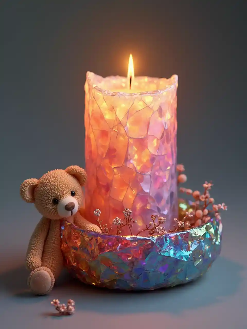 Mignonne bougie arc-en-ciel sur le thème du cristal polygonal 🕯️ Ours en peluche à côté des ornements du centre et des bougies dans le panier arc-en-ciel
