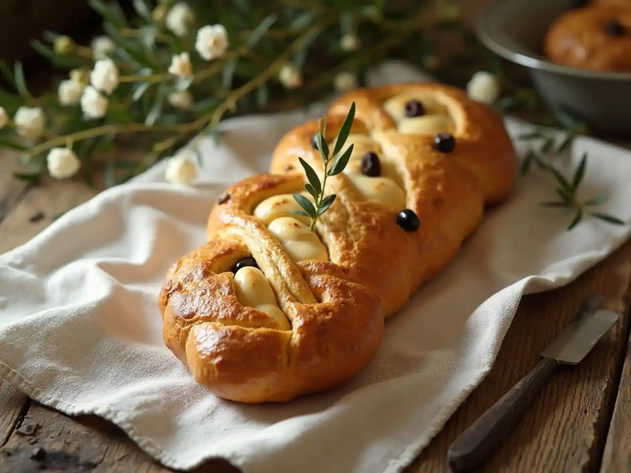 "Une photo très réaliste de la traditionnelle Resta di Como, un pain de sucre de Pâques italien allongé avec une peau brun doré et des raisins secs. Un petit rameau d'olivier est inséré dans le pain. La Resta est posée sur une table en bois rustique recouverte de linge souple, entourée de rameaux d'olivier frais et de fleurs printanières délicates. Les lumières sont naturellement chaleureuses et projettent des ombres douces, soulignant la texture du pain et la fraîcheur des éléments environnants. Il y a une ambiance cosy, séduisante, traditionnelle italienne sur place, idéale pour les fêtes de Pâques. "