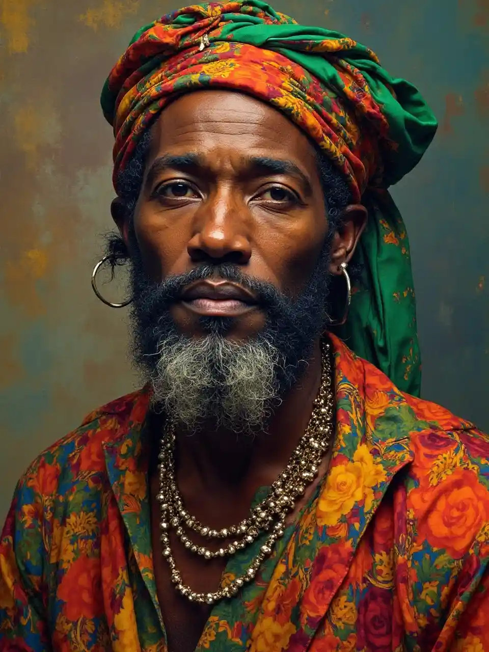 Un portrait d'homme jamaïcain dans le style de Mati Klarwein