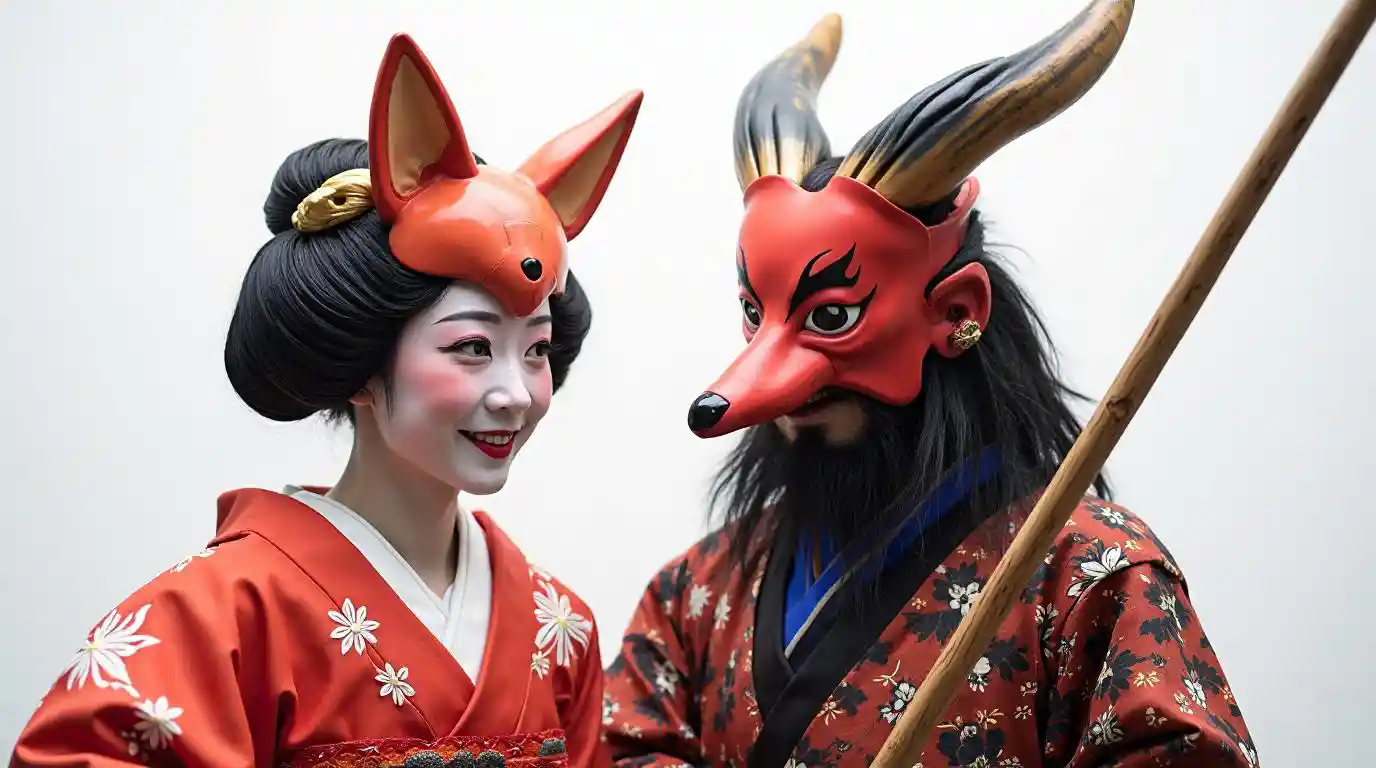 Lors de l'événement COSPLAY au Japon, une geisha japonaise portant un masque de renard à fond blanc et un homme japonais tenant une canne, un masque de Tengu au visage rouge, un mollet et un nez longs ont été photographiés ensemble. Ils ont regardé le public avec un sourire.